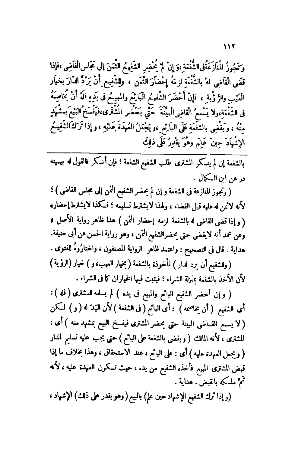 وتجوز المنازعة في الشفعة، وإن لم يحضر الشفيع الثمن إلى مجلس القاضي، فإذا قضى القاضي له بالشفعة لزمه إحضار الثمن، وللشفيع أن يرد الدار بخيار العيب والرؤية، فإن أحضر الشفيع البائع والمبيع في يده فله أن يخاصمه في الشفعة، ولا يسمع القاضي البينة حتى يحضر المشتري، فيفسخ البيع بمشهدٍ منه، ويقضي بالشفعة على البائع، ويجعل العهدة عليه، وإذا ترك الشفيع الإشهاد حين علم وهو يقدر على ذلك