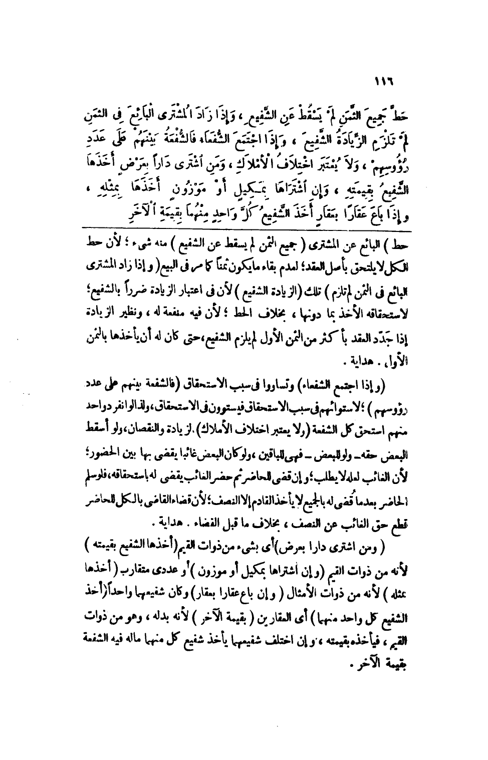 وإذا زاد المشتري البائع في الثمن لم تلزم الزيادة الشفيع، وإذا اجتمع الشفعاء فالشفعة بينهم على عدد رؤوسهم، ولا يعتبر اختلاف الأملاك، ومن اشترى داراً بعوضٍ أخذها الشفيع بقيمته، وإن اشتراها بمكيلٍ أو موزونٍ أخذها بمثله، وإذا باع عقاراً بعقارٍ أخذ الشفيع كل واحدٍ منهما بقيمة الآخر