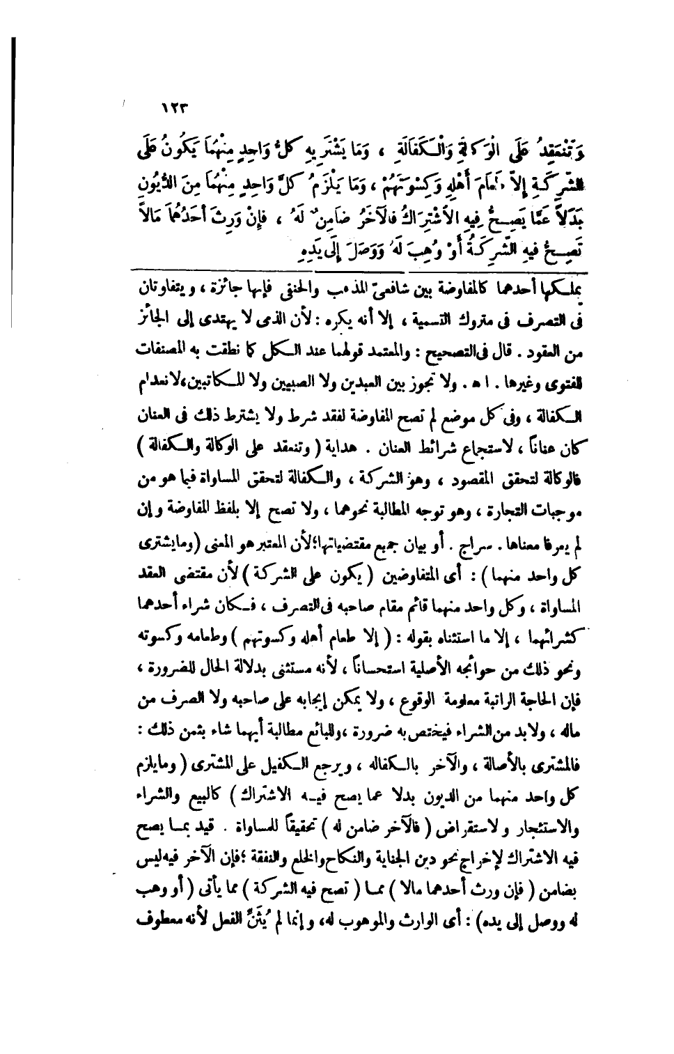 يملكها أحدهما كالمفاوضة بين شافعي المذهب والحنفي فإنها جائزة، ويتفاوتان في التصرف في متروك التسية، إلا أنه يكره: لأن الذمي لا يهتدي إلى الجائز من العقود. قال في التصحيح: والمعتمد قولهما عند الكل كما نطقت به المصنفات للفتوى وغيرها. اهـ. ولا تجوز بين العبدين ولا الصبيين ولا المكاتبين، لانعدام الكفالة، وفي كل موضع لم تصح المفاوضة لفقد شرط ولا يشترط ذلك في العنان كان عناناً، لاستجماع شرائط العنان. هداية (وتنعقد على الوكالة والكفالة) فالوكالة لتحقق المقصود، وهو الشركة، والكفالة لتحقق المساواة فيما هو من موجبات التجارة، وهو توجه لمطالبة نحوهما، ولا تصح إلا بلفظ المفاوضة وإن لم يعرفا معناها. سراج. أو بيان جميع مقتضياتها؛ لأن المعتبر هو المعنى (وما يشتري كل واحد منهما) : أي المتفاوضين (يكون على الشركة) لأن مقتضى العقد المساواة، وكل واحد منهما قائم مقام صاحبه في التصرف، فكان شراء أحدهما كشرائهما، إلا ما استثناه بقوله: (إلا طعام أهله وكسوتهم) وطعامه وكسوته ونحو ذلك من حوائجه الأصلية استحساناً، لأنه مستثنى بدلالة الحال للضرورة، فإن الحاجة الراتبة معلومة الوقوع، ولا يمكن إيجابه على صاحبه ولا الصرف من ماله، ولابد من الشراء فيختص به ضرورة، وللبائع مطالبة أيهما شاء بثمن ذلك: فالمشتري بالأصالة، والآخر بالكفالة، ويرجع الكفيل على المشتري (وما يلزم كل واحد منهما من الديون بدلا عما يصح فيه الاشتراك) كالبيع والشراء والاستئجار والاستقراض (فالآخر ضامن له) تحقيقاً للمساواة. قيد بما يصح فيه الاشتراك لإخراج نحو دين الجناية والنكاح والخلع والنفقة؛ فإن الآخر فيه ليس بضامن (فإن ورث أحدهما مالا) مما (تصح فيه الشركة) مما يأتي (أو وهب له ووصل إلى يده) : أي الوارث والموهوب له، وإنما لم يثن الفعل لأنه معطوف