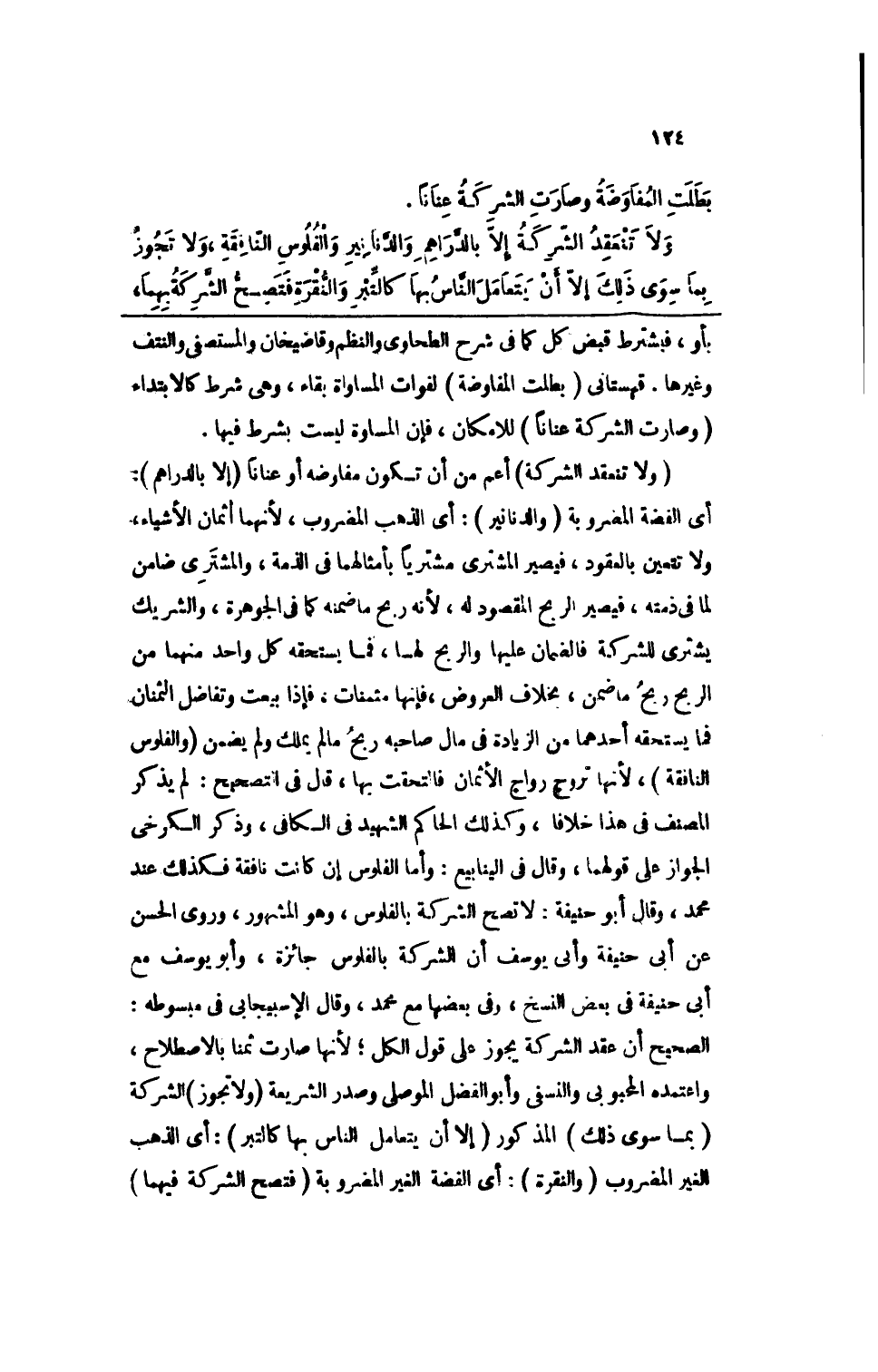 (ولا تنعقد الشركة) أعم من أن تكون مفاوضة أو عناناً (إلا بالدراهم) : أي الفضة المضروبة (والدنانير) : أي الذهب المضروب، لأنهما أثمان الأشياء، ولا تتعين بالعقود، فيصير المشتري مشترياً بأمثالهما في الذمة، والمشتري ضامن لما في ذمته، فيصير الربح المقصود له، لأنه ربح ما ضمنه كما في الجوهرة، والشريك يشتري للشركة فالضمان عليهما والربح لها، فما يستحقه كل واحد منهما من الربح ربح ما ضمن، بخلاف العروض، فإنها مثمنات، فإذا بيعت وتفاضل الثمنان فما يستحقه أحدهما من الزيادة في مال صاحبه ربح ما لم يملك ولم يضمن (والفلوس النافقة) ، لأنها تروج رواج الأثمان فالتحقت بها، قال في التصحيح: لم يذكر المصنف في هذا خلافا، وكذلك الحاكم الشهيد في الكافي، وذكر الكرخي الجواز على قولهما، وقال في الينابيع: وأما الفلوس إن كانت نافقة فكذلك عند محمد، وقال أبو حنيفة: لا تصح الشركة بالفلوس، وهو المشهور، وروى الحسن عن أبي حنيفة وأبي يوسف أن الشركة بالفلوس جائزة، وأبو يوسف مع أبي حنيفة في بعض النسخ، وفي بعضها مع محمد، وقال الإسبيجاني في مبسوطه: الصحيح أن عقد الشركة يجوز على قول الكل؛ لأنها صارت ثمنا بالاصطلاح، واعتمده المحبوبي والنسفي وأبو الفضل الموصلي وصدر الشريعة (ولا تجوز) الشركة (بما سوى ذلك) المذكور (إلا أن يتعامل الناس بها كالتبر) : أي الذهب الغير المضروب (والنقرة) : أي الفضة الغير المضروبة (فتصح الشركة فيهما)