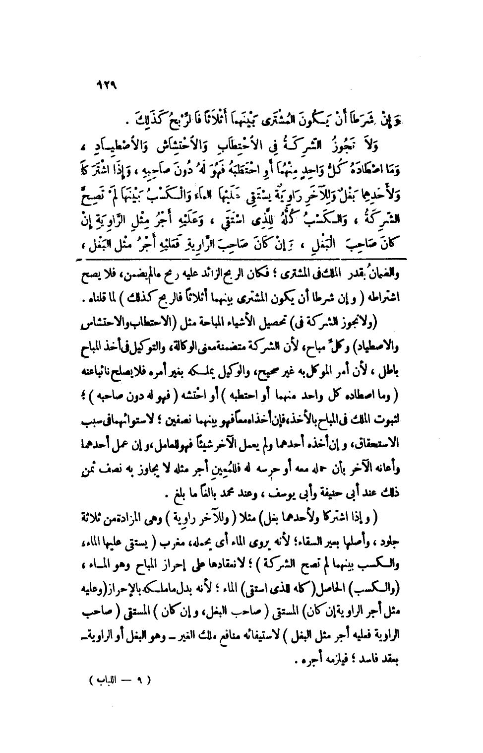 ولا تجوز الشركة في الاحتطاب والاحتشاش والاصطياد، وما اصطاده كل واحدٍ منهما أو احتطبه فهو له دون صاحبه، وإذا اشتركا ولأحدهما بغلٌ وللآخر روايةٌ يستقي عليها الماء والكسب بينهما لم تصح الشركة، والكسب كله للذي استقى، وعليه أجر مثل الرواية إن كان صاحب البغل، وإن كان صاحب الرواية فعليه أجر مثل البغل،