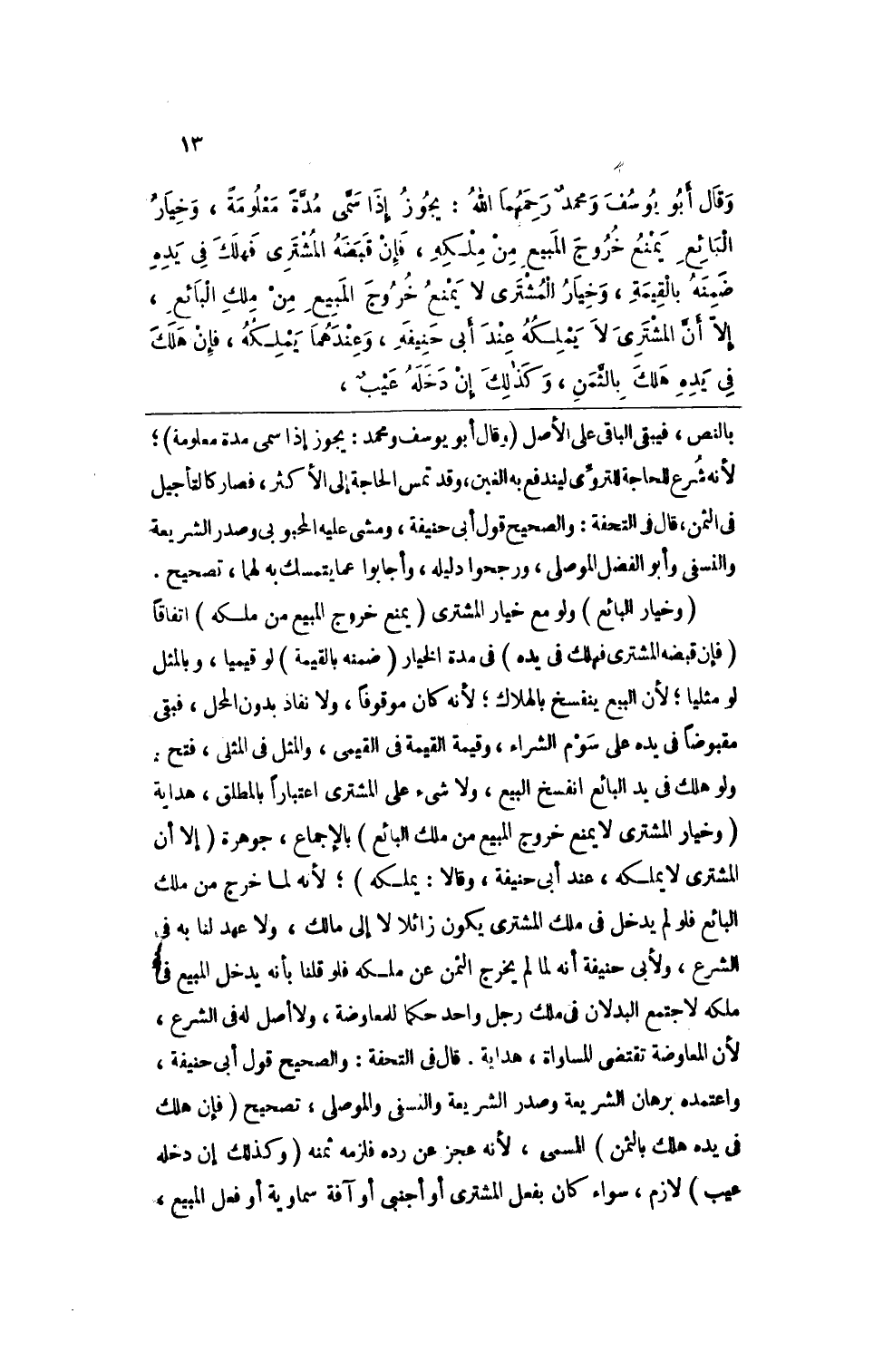 (وخيار البائع) ولو مع خيار المشتري (يمنع خروج المبيع من ملكه) اتفاقا (فإن قبضه المشتري فهلك في يده) في مدة الخيار (ضمنه بالقيمة) لو قيميا، وبالمثل لو مثليا؛ لأن البيع ينفسخ بالهلاك لأنه كان موقوفا، ولا نفاذ بدون المحل؛ فبقي مقبوضاً في يده على سوم الشراء، وفيه القيمة في القيمى والمثل في المثلى. فتح. ولو هلك في يد البائع انفسخ البيع، ولا شيء على المشتري اعتباراً بالمطلق. هداية (وخيار المشتري لا يمنع خروج المبيع من ملك البائع) بالإجماع. جوهرة. إلا أن المشتري لا يملكه عند أبي حنيفة، وقالا: يملكه) ؛ لأنه لما خرج من ملك البائع فلو لم يدخل في ملك المشتري يكون زائلا لا إلى مالك، ولا عهد لنا به في الشرع، ولأبي حنيفة أنه لما لم يخرج الثمن عن ملكه فلة قلنا بأنه يدخل في المبيع في ملكه لاجتمع البدلان في ملك رجل واحد حكما للمعاوضة، ولا أصل له في الشرع؛ لأن المعاوضة تقتضي المساواة. هداية. قال في التحفة: والصحيح قول أبي حنيفة، واعتمده برهان الشريعة وصدر الشريعة والنسفي والموصلي. تصحيح (فإن هلك في يده هلك بالثمن) المسمى، لأنه عجز عن رده فلزمه ثمنه (وكذلك إن دخله عيب) لازم؛ سواء كان بفعل المشتري أو أجنبي أو آفة سماوية أو فعل المبيع،