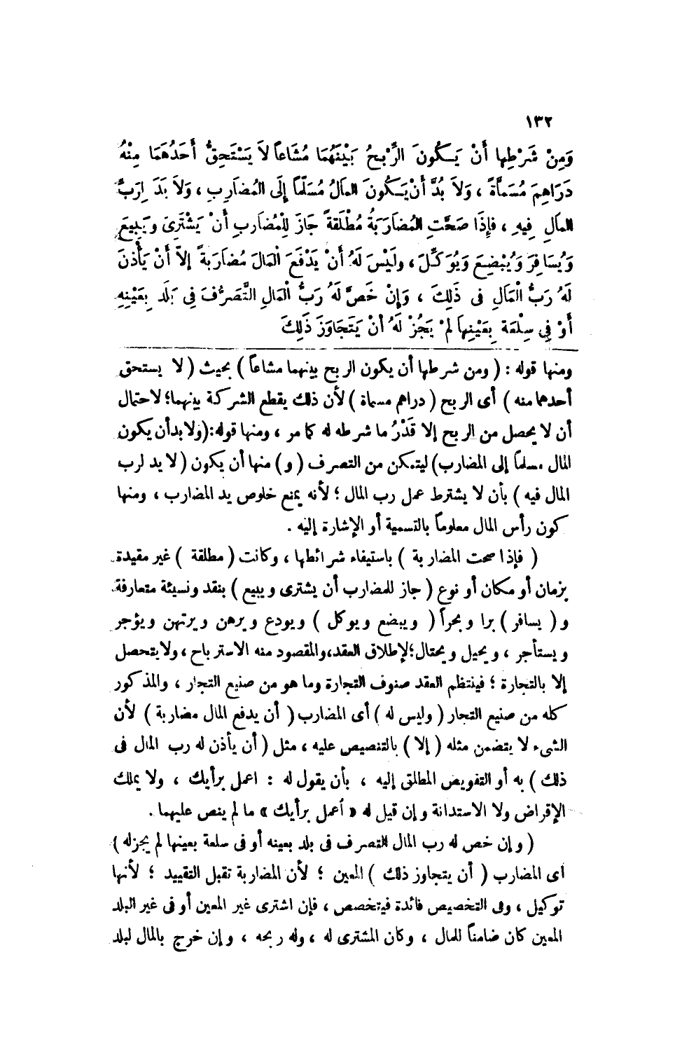 ومن شرطها أن يكون الربح بينهما مشاعاً لا يستحق أحدهما منه دراهم مسماةً، ولابد أن يكون المال مسلماً إلى المضارب، ولا يد لرب المال فيه، فإذا صحت المضاربة مطلقةً جاز للمضارب أن يشتري ويبيع ويسافر ويبضع ويوكل، وليس له أن يدفع المال مضاربةً إلا أن يأذن له رب المال في ذلك، وإن خص له رب المال التصرف في بلد بعينه أو في سلعة بعينها لم يجز له أن يتجاوز ذلك.