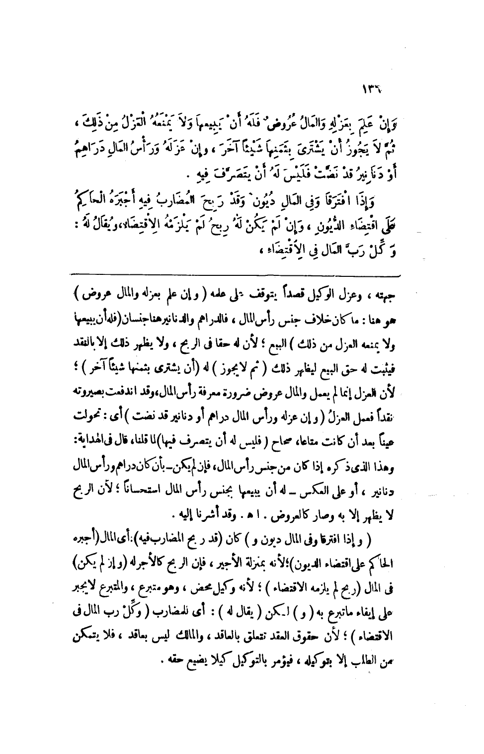جهته، وعزل الوكيل قصداً يتوقف على علمه (وإن علم بعزله والمال عروض) هو هنا: ما كان خلاف جنس رأس المال، فالدراهم والدنانير هنا جنسان (فله أن يبيعها ولا يمنعه العزل من ذلك) البيع؛ لأن له حقا في الربح، ولا يظهر ذلك إلا بالعقد فيثبت له حق البيع ليظهر ذلك (ثم لا يجوز) له (أن يشتري بثمنها شيئاً آخر) ؛ لأن العزل إنما يعمل والمال عروض ضرورة معرفة رأس المال، وقد اندفعت بصيرورته نقداً فعمل العزل (وإن عزله ورأس المال دراهم أو دنانير قد نضت) أي: تحولت عيناً بعد أن كانت متاعا، صحاح (فليس له أن يتصرف فيها) لما قلنا، قال في الهداية: وهذا الذي ذكره إذا كان من جنس رأس المال، فإن لم يكن - بأن كان دراهم ورأس المال دنانير، أو على العكس - له أن يبيعها بجنس رأس المال استحساناً؛ لأن الربح لا يظهر إلا به وصار كالعروض. اهـ. وقد أشرنا إليه.