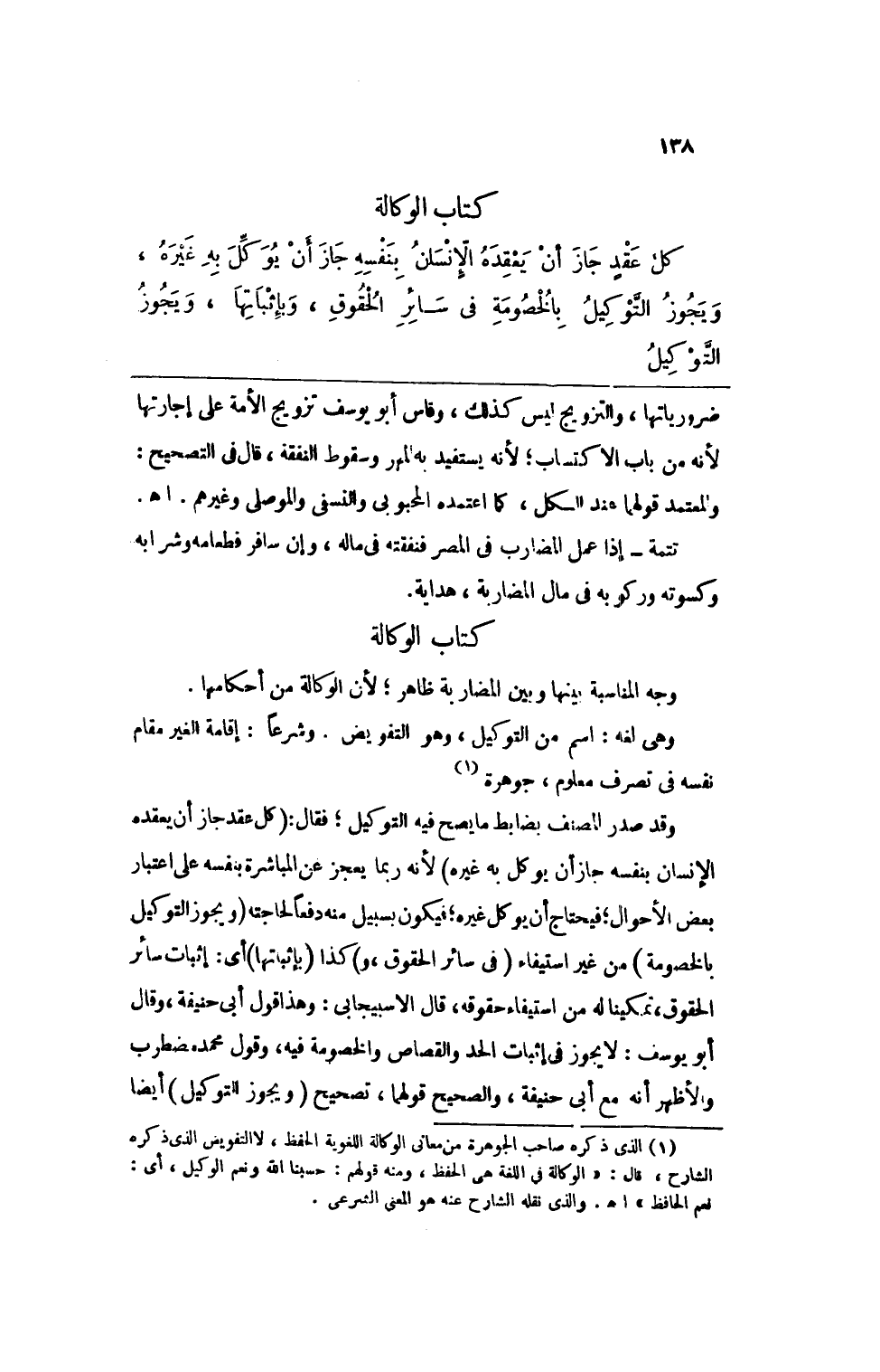 وقد صدر المصنف بضابط ما يصح فيه التوكيل؛ فقال: (كل عقد جاز أن يعقده الإنسان بنفسه جاز أن يوكل به غيره) لأنه ربما يعجز عن المباشرة بنفسه على اعتبار بعض الأحوال؛ فيحتاج أن يوكل غيره؛ فيكون بسبيل منه دفعاً لحاجته (ويجوز التوكيل بالخصومة) من غير استيفاء (في سائر الحقوق، و) كذا (بإثباتها) أي: إثبات سائر الحقوق، تمكينا له من استيفاء حقوقه، قال الإسبيجاني: وهذا قول أبي حنيفة، وقال أبو يوسف: لا يجوز في إثبات الحد والقصاص والخصومة فيه، وقول محمد مضطرب والأظهر أنه مع أبي حنيفة، والصحيح قولهما، تصحيح (ويجوز التوكيل) أيضا
