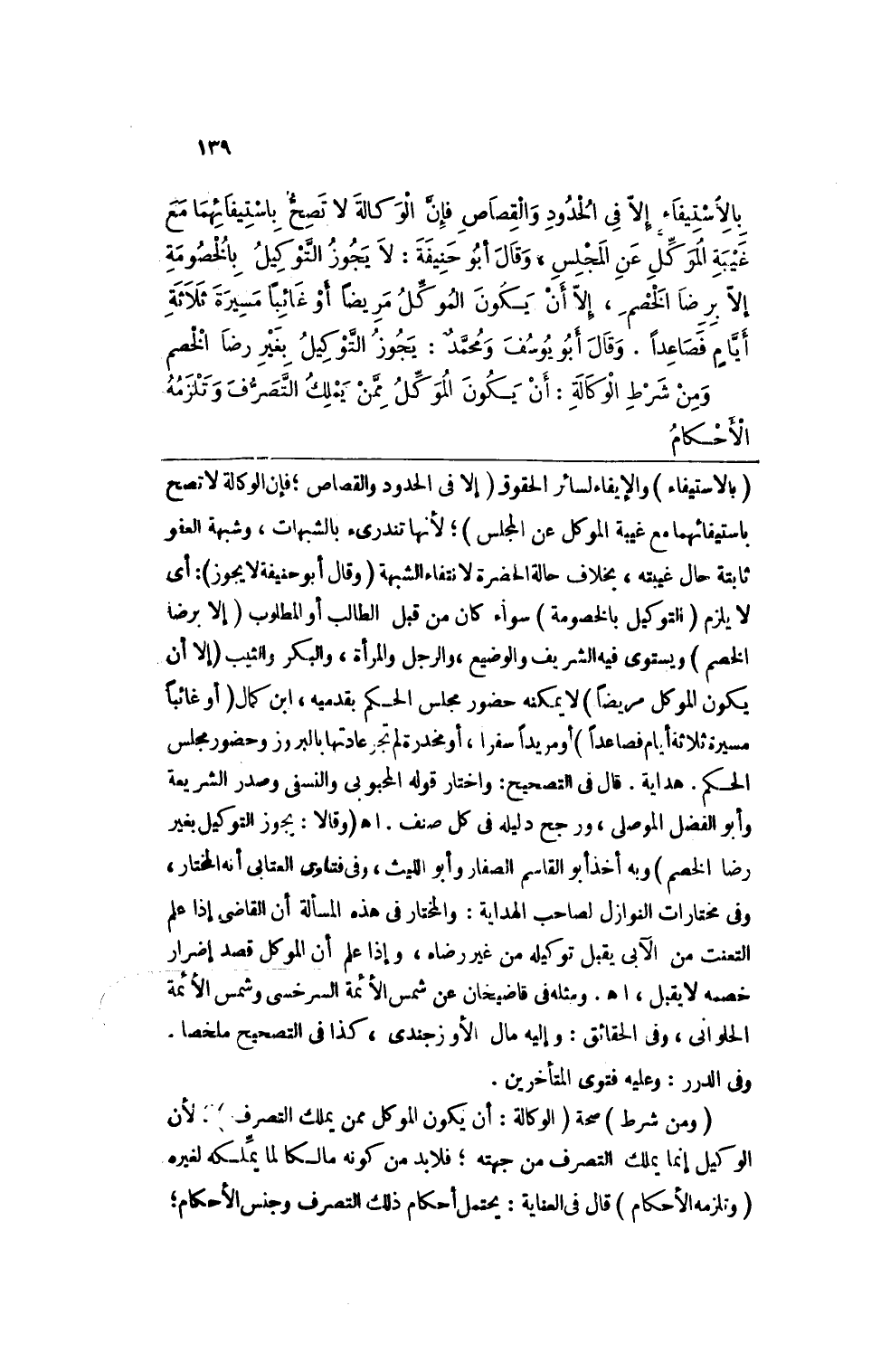 (بالاستيفاء) والإيفاء لسائر الحقوق (إلا في الحدود والقصاص؛ فإن الوكالة لا تصح باستيفائهما مع غيبة الموكل عن المجلس) ؛ لأنها تندرئ بالشبهات، وشبهة العفو ثابتة حال غيبته، بخلاف حالة الحضرة لانتفاء الشبهة (وقال أبو حنيفة لا يجوز) : أي لا يلزم (التوكيل بالخصومة) سواء كان من قبل الطالب أو المطلوب (إلا برضا الخصم) ويستوي فيه الشريف والوضيع، والرجل والمرأة، والبكر والثيب (إلا أن يكون الموكل مريضاً) لا يمكنه حضور مجلس الحكم بقدميه، ابن كمال (أو غائباً مسيرة ثلاثة أيام فصاعداً) أو مريداً سفرا، أو مخدرة لم تجر عادتها بالبروز وحضور مجلس الحكم. هداية. قال في التصحيح: واختار قوله المحبوبي والنسفي وصدر الشريعة وأبو الفضل الموصلي، ورجح دليله في كل صنف. اهـ (وقالا: يجوز التوكيل بغير رضا الخصم) وبه أخذ أبو القاسم الصفار وأبو الليث، وفي فتاوى العتابي أنه المختار، وفي مختارات النوازل لصاحب الهداية: والمختار في هذه المسألة أن القاضي إذا علم التعنت من الآبى يقبل توكيله من غير رضاه، وإذا علم أن الموكل قصد إضرار خصمه لا يقبل، اهـ. ومثله في قاضيخان عن شمس الأئمة السرخسي وشمس الأئمة الحلواني، وفي الحقائق: وإليه مال الأوزجندي، كذا في التصحيح ملخصا. وفي الدرر: وعليه فتوى المتأخرين.