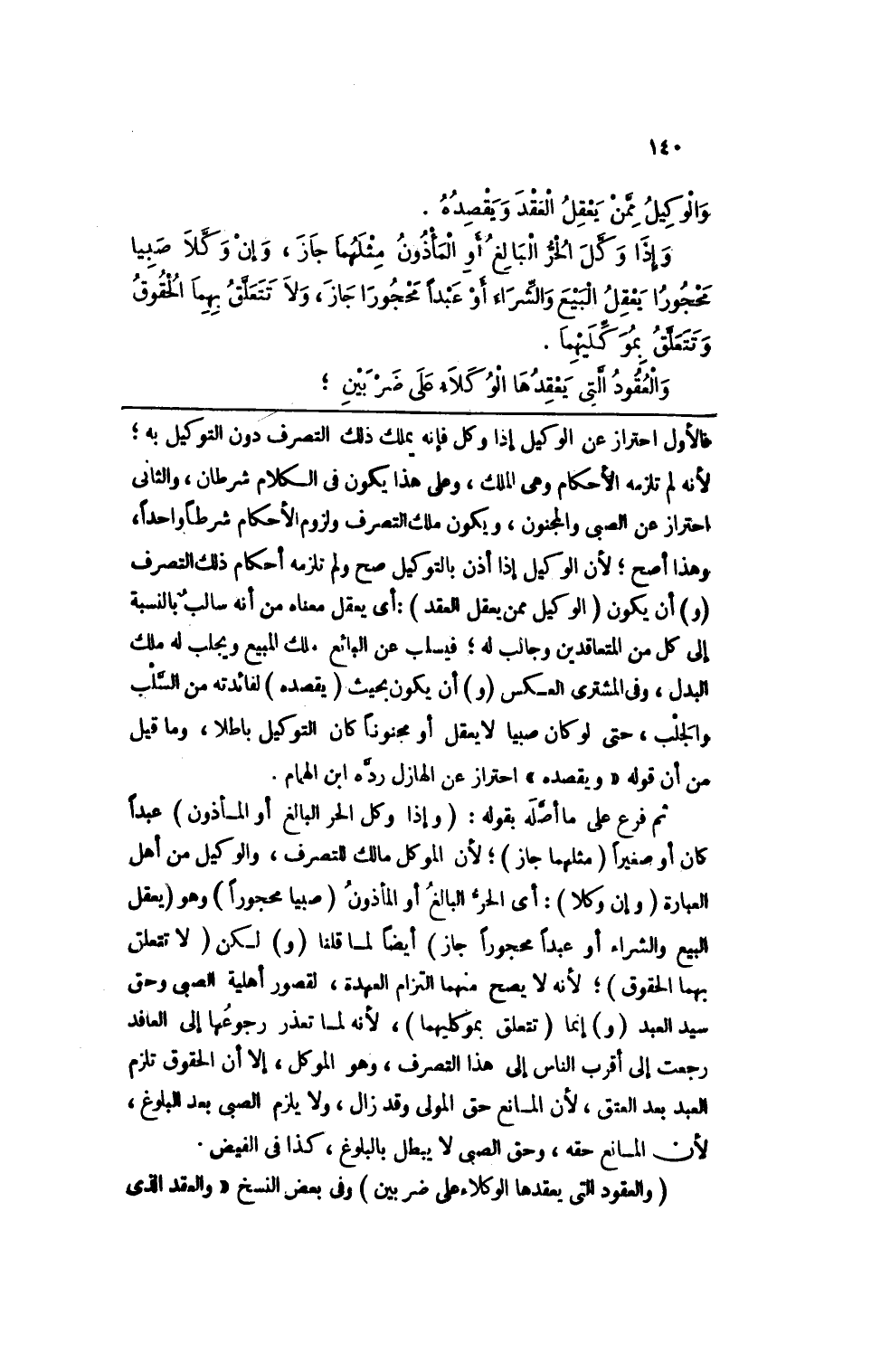 (ثم فرع على ما أصله بقوله: (وإذا وكل الحر البالغ أو المأذون) عبداً كان أو صغيراً (مثلهما جاز) ؛ لأن الموكل مالك للتصرف، والوكيل من أهل العبارة (وإن وكلا) : أي الحر البالغ أو المأذون (صبيا محجوراً) وهو (يعقل البيع والشراء أو عبداً محجوراً جاز) أيضاً لما قلناه (و) لكن (لا تتعلق بهما الحقوق) ؛ لأنه لا يصح منهما التزام العهدة، لقصور أهلية الصبي وحق سيد العبد (و) إنما (تتعلق بموكليها) ، لأنه لما تعذر رجوعها إلى العاقد رجعت إلى أقرب الناس إلى هذا التصرف، وهو الموكل، إلا أن الحقوق تلزم العبد بعد العتق، لأن المانع حق المولى وقد زال، ولا يلزم الصبي بعد البلوغ، لأن المانع حقه، وحق الصبي لا يبطل بالبلوغ، كذا في الفيض.
