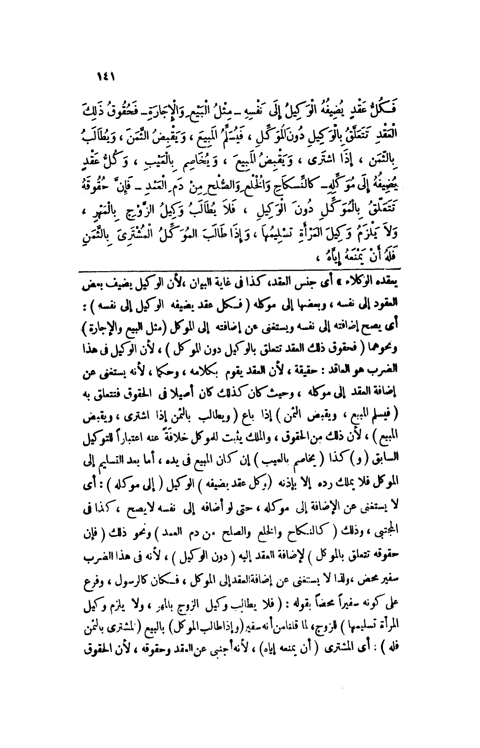 يعقده الوكلاء" أي جنس العقد، كذا في غاية البيان، لأن الوكيل يضيف بعض العقود إلى نفسه، وبعضها إلى موكله (فكل عقد يضيفه الوكيل إلى نفسه) : أي يصح إضافته إلى نفسه ويستغني عن إضافته إلى الموكل (مثل البيع والإجارة) ونحوهما (فحقوق ذلك العقد تتعلق بالوكيل دون الموكل) ، لأن الوكيل في هذا الضرب هو العاقد: حقيقة، لأن العقد يقوم بكلامه، وحكما، لأنه يستغني عن إضافة العقد إلى موكله، وحيث كان كذلك كان أصيلا في الحقوق فتتعلق به (فيسلم المبيع، ويقبض الثمن) إذا باع (ويطالب بالثمن إذا اشترى، ويقبض المبيع) ، لأن ذلك من الحقوق، والملك يثبت للموكل خلافةً عنه اعتباراً للتوكيل السابق (و) كذا (يخاصم بالعيب) إن كان المبيع في يده، أما بعد التسليم إلى الموكل فلا يملك رده إلا بإذنه (وكل عقد يضيفه) الوكيل (إلى موكله) : أي لا يستغني عن الإضافة إلى موكله، حتى لو أضافه إلى نفسه لا يصح، كذا في المجتبى، وذلك (كالنكاح والخلع والصلح من دم العمد) ونحو ذلك (فإن حقوقه تتعلق بالموكل) لإضافة العقد إليه (دون الوكيل) ، لأنه في هذا الضرب سفير محض، ولذا لا يستغني عن إضافة العقد إلى الموكل، فكان كالرسول، وفرع على كونه سفيراً محضاً بقوله: (فلا يطالب وكيل الزوج بالمهر، ولا يلزم وكيل المرأة تسليمها) للزوج، لما قلنا من أنه سفير (وإذا طالب الموكل) بالبيع (المشتري بالثمن فله) : أي المشتري (أن يمنعه إياه) ، لأنه أجنبي عن العقد وحقوقه، لأن الحقوق