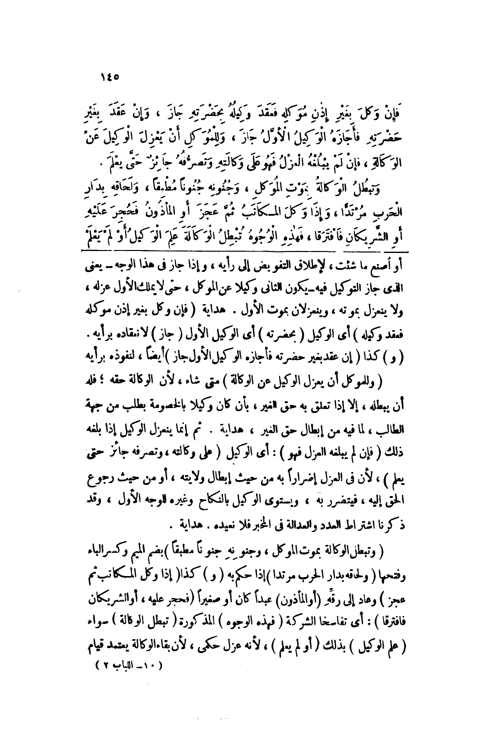 أو اصنع ما شئت، لإطلاق التفويض إلى رأيه، وإذا جاز في هذا الوجه - يعني الذي جاز التوكيل فيه - يكون الثاني وكيلا عن الموكل، حتى لا يملك الأول عزله، ولا ينعزل بموته، وينعزلان بموت الأول. هداية (فإن وكل بغير إذن موكله فعقد وكيله) أي الوكيل (بحضرته) أي الوكيل الأول (جاز) لانعقاده برأيه. (و) كذا (إن عقد بغير حضرته فأجازه الوكيل الأول جاز) أيضاً، لنفوذه برأيه (وللموكل أن يعزل الوكيل عن الوكالة) متى شاء، لأن الوكالة حقه؛ فله أن يبطله، إلا إذا تعلق به حق الغير، بأن كان وكيلا بالخصومة بطلب من جهة الطالب، لما فيه من إبطال حق الغير، هداية. ثم إنما ينعزل الوكيل إذا بلغه ذلك (فإن لم يبلغه العزل فهو) : أي الوكيل (على وكالته، وتصرفه جائز حتى يعلم) ، لأن في العزل إضراراً به من حيث إبطال ولايته، أو من حيث رجوع الحق إليه، فيتضرر به، ويستوي الوكيل بالنكاح وغيره للوجه الأول، وقد ذكرنا اشتراط العدد والعدالة في المخبر فلا نعيده. هداية.
