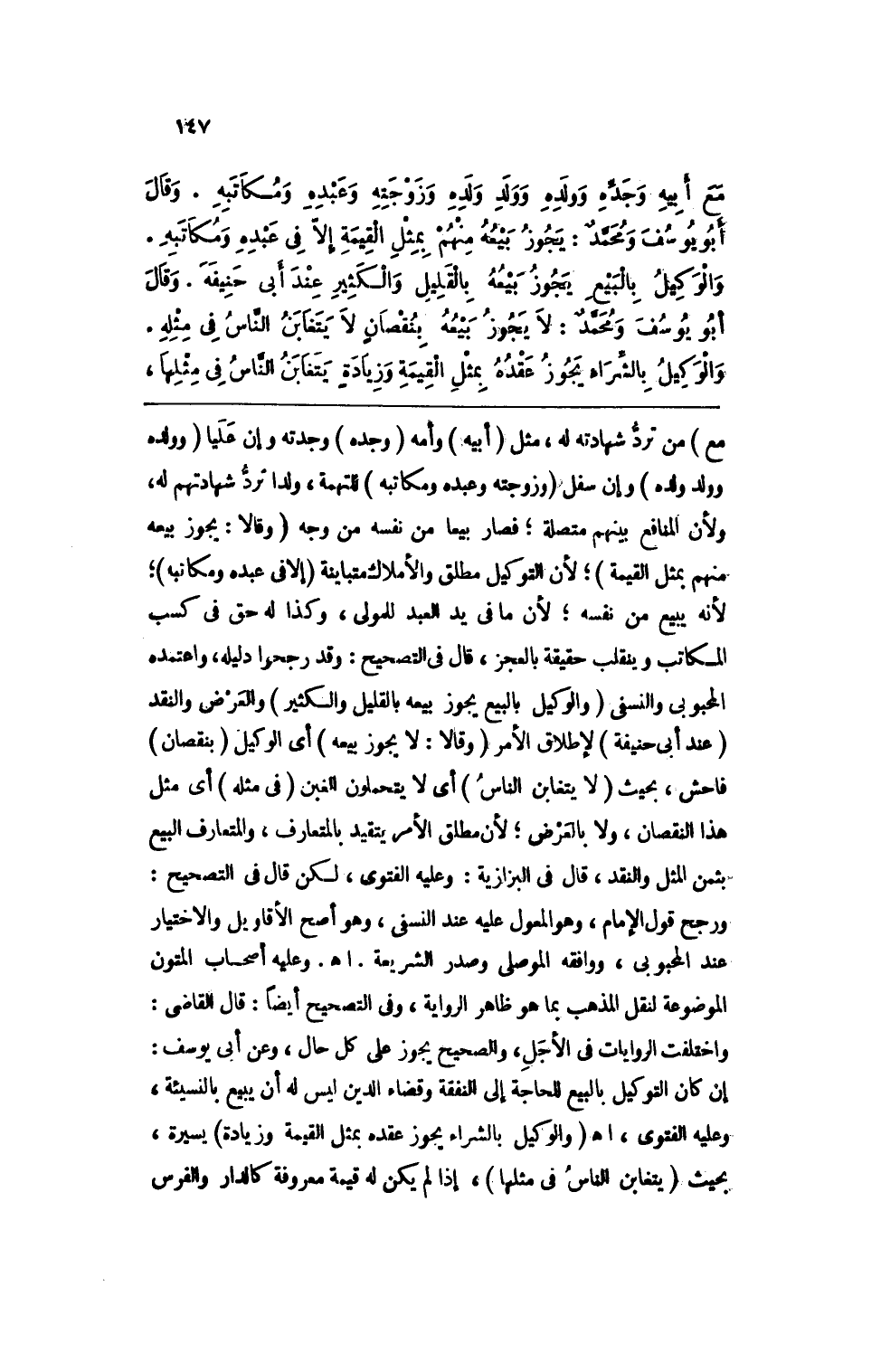 مع أبيه وجده وولده وولد ولده وزوجته وعبده ومكاتبه. وقال أبو يوسف ومحمدٌ: يجوز بيعه منهم بمثل القيمة إلا في عبده ومكاتبه. والوكيل بالبيع يجوز بيعه بالقليل والكثير عند أبي حنيفة. وقال أبو يوسف ومحمدٌ: لا يجوز بيعه بنقصانٍ لا يتغابن الناس في مثله. والوكيل بالشراء يجوز عقده بمثل القيمة وزيادةٍ يتغابن الناس في مثلها،