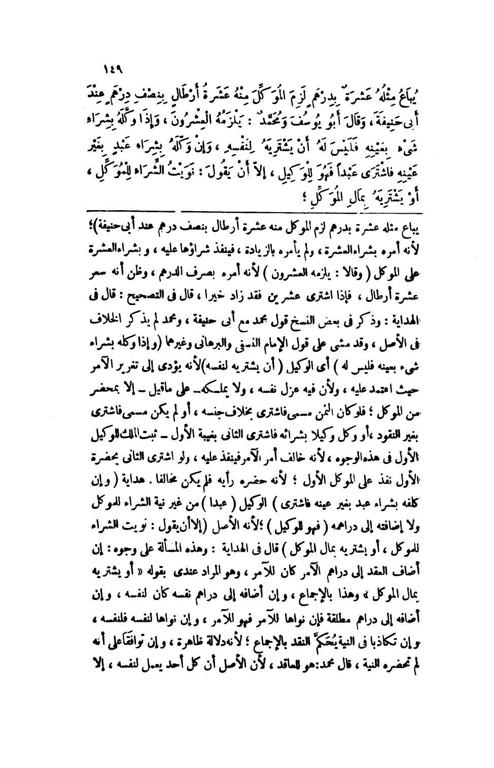 يباع مثله عشرةٌ بدرهمٍ لزم الموكل منه عشرة أرطالٍ بنصف درهمٍ عند أبي حنيفة، وقال أبو يوسف ومحمدٌ: يلزمه العشرون، وإذا وكله بشراء شيء بعينه فليس له أن يشتريه لنفسه، وإن وكله بشراء عبدٍ بغير عينه فاشترى عبداً فهو للوكيل، إلا أن يقول: نويت الشراء للموكل، أو يشتريه بمال الموكل؛