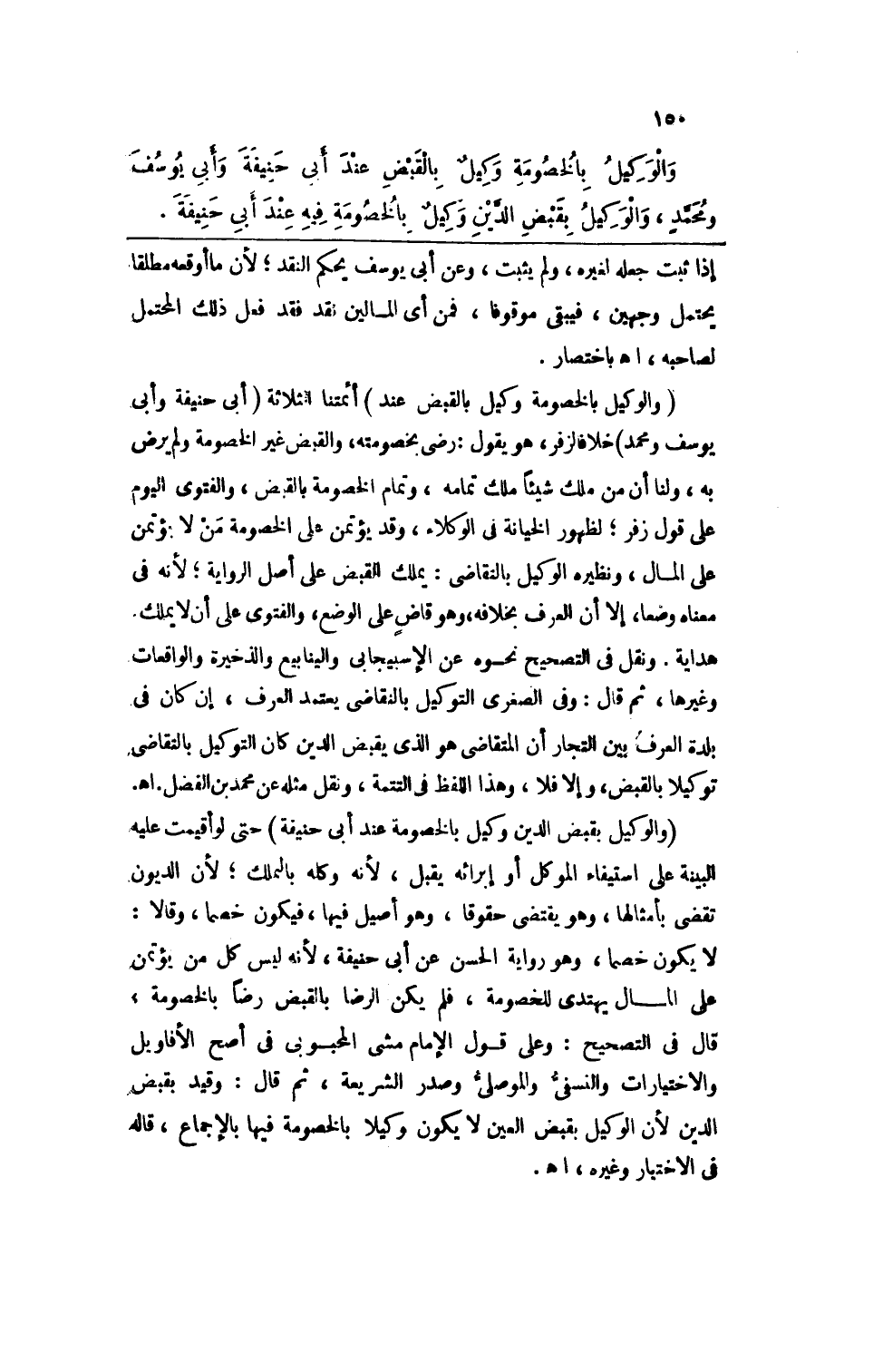 والوكيل بالخصومة وكيلٌ بالقبض عند أبي حنيفة وأبي يوسف ومحمدٍ، والوكيل يقبض الدين وكيلٌ بالخصومة فيه عند أبي حنيفة.