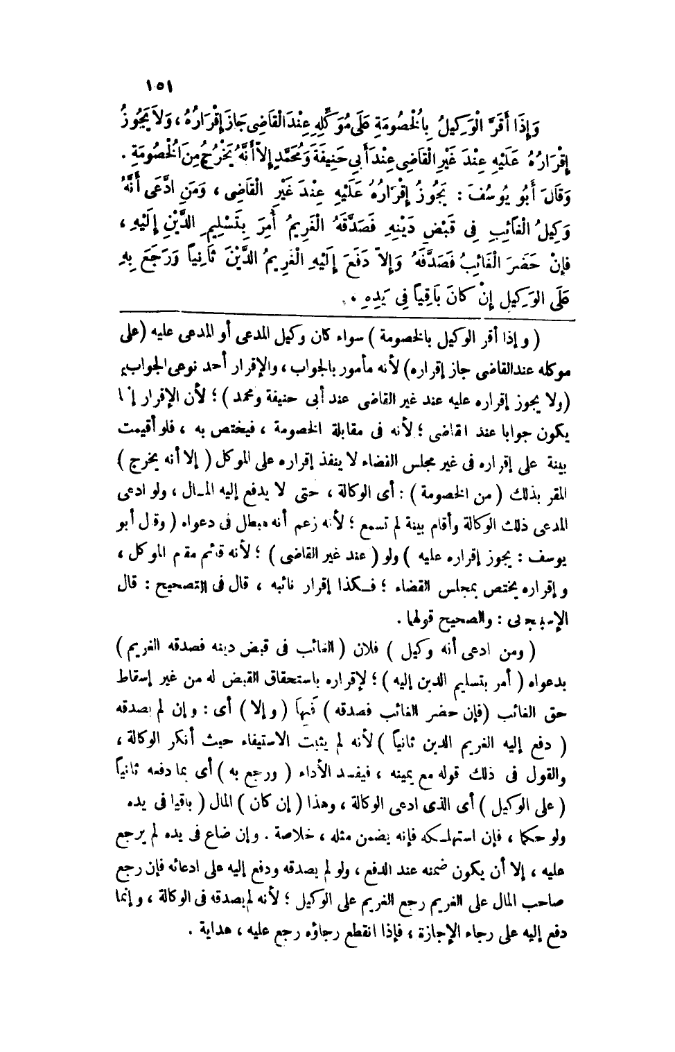 (وإذا أقر الوكيل بالخصومة) سواء كان وكيل المدعي أو المدعى عليه (على موكله عند القاضي جاز إقراره) لأنه مأمور بالجواب، والإقرار نوعي الجواب (ولا يجوز إقراره عليه عند غير القاضي عند أبي حنيفة ومحمد) ؛ لأن الإقرار إنما يكون جوبا عند القاضي؛ لأنه في مقابلة الخصومة، فيختص به، فلو أقيمت بينة على إقراره في غير مجلس القضاء لا ينفذ إقراره على الموكل (إلا أنه يخرج) المقر بذلك (من الخصومة) : أي الوكالة، حتى لا يدفع إليه المال، ولو ادعى المدعي ذلك الوكالة وأقام بينة لم تسمع؛ لأنه زعم أنه مبطل في دعواه (وقال أبو يوسف: يجوز إقراره عليه) ولو (عند غير القاضي) ؛ لأنه قائم مقام الموكل، وإقراره يختص بمجلس القضاء؛ فكذا إقرار نائبه، قال في التصحيح: قال الإسبيجاني: والصحيح قولهما.