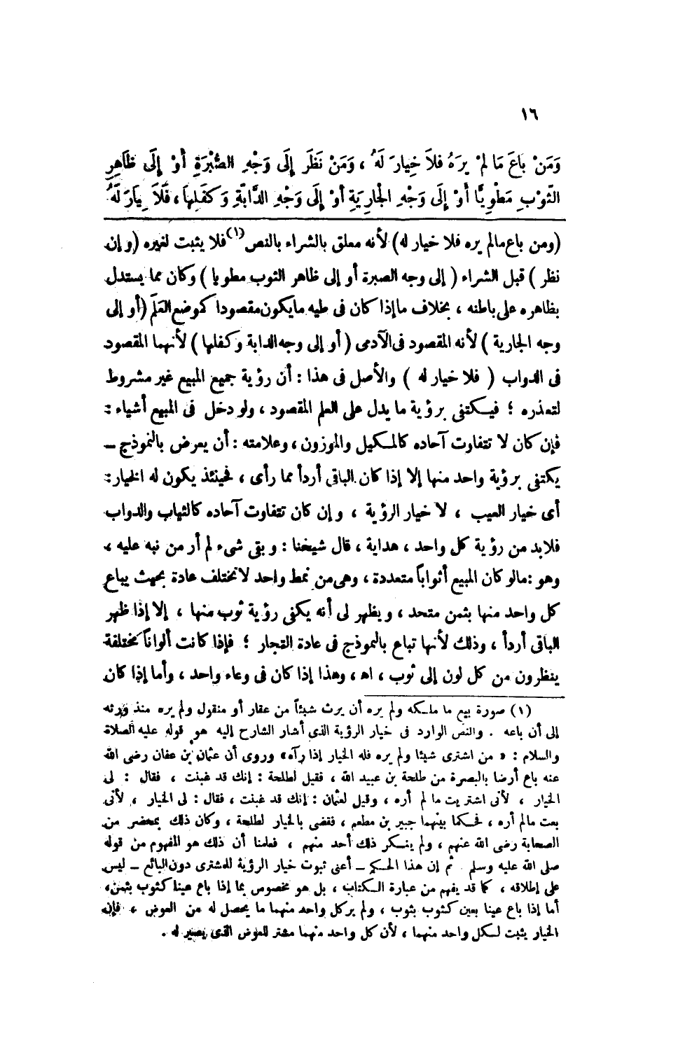 (ومن باع مالم يره فلا خيار له) لأنه معلق بالشراء بالنص فلا يثبت لغيره (وإن نظر) قبل الشراء (إلى وجه الصبرة أو إلى ظاهر الثوب مطويا) وكان مما يستدل بظاهره على باطنه، بخلاف ما إذا كان في طيه ما يكون مقصودا كموضع العلم (أو إلى وجه الجارية) لأنه المقصود في الآدمي (أو إلى وجه الدابة وكفلها) لأنهما المقصود في الدواب (فلا خيار له) والأصل في هذا أن رؤية جميع المبيع غير مشروط لتعذره؛ فيكتفي برؤية ما يدل على العلم بالمقصود، ولو دخل في المبيع أشياء: فإن كان لا تتفاوت آحاده كالمكيل والموزون - وعلامته: أن يعرض بالنموذج - يكتفى برؤية واحد منها إلا إذا كان الباقي أردأ مما رأى؛ فحينئذ يكون له الخيار. أي خيار العيب، لا خيار الرؤية، وإن كان تتفاوت آحاده كالثياب والدواب فلا بد من رؤية كل واحد. هداية. قال شيخنا: وبقي شيء لم آر من نبه عليه. وهو ما لو كان المبيع أثوابا متعددة وهي من نمط واحد لا يختلف عادة بحيث يباع كل واحد منها بثمن متحد، ويظهر لي أنه يكفي رؤية ثوب منها، إلا إذا ظهر الباقي أردأ وذلك لأنها تباع بالنموذج في عادة التجار؛ فإذا كانت ألوانا مختلفة ينظرون من كل لون إلى ثوب. اهـ. وهذا إذات كان في وعاء واحد، وأما إذا كان