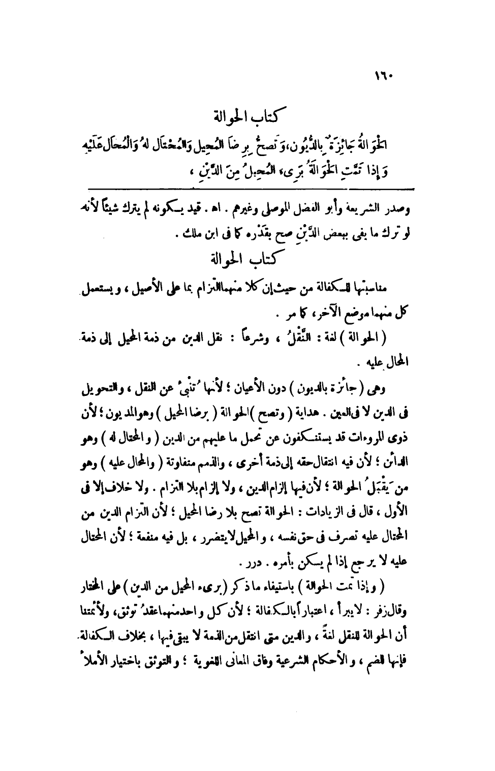 وهي (جائزة بالديون) دون الأعيان؛ لأنها تنبئ عن النقل، والتحويل في الدين لا في العين. هداية (وتصح) الحوالة (برضا المحيل) وهو المديون؛ لأن ذوي المروءات قد يستنكفون عن تحمل ما عليهم من الدين (والمحتال له) وهو الدائن؛ لأن فيه انتقال حقه إلى ذمة أخرى، والذمم متفاوتة (والمحال عليه) وهو من يقبل الحوالة؛ لأن فيها إلزام الدين، ولا إلزام بلا التزام. ولا خلاف إلا في الأول، قال في الزيادات: الحوالة تصح بلا رضا المحيل؛ لأن التزام الدين من المحتال عليه تصرف في حق نفسه، والمحيل لا يتضرر، بل فيه منفعة؛ لأن المحتال عليه لا يرجع إذا لم يكن بأمره. درر.