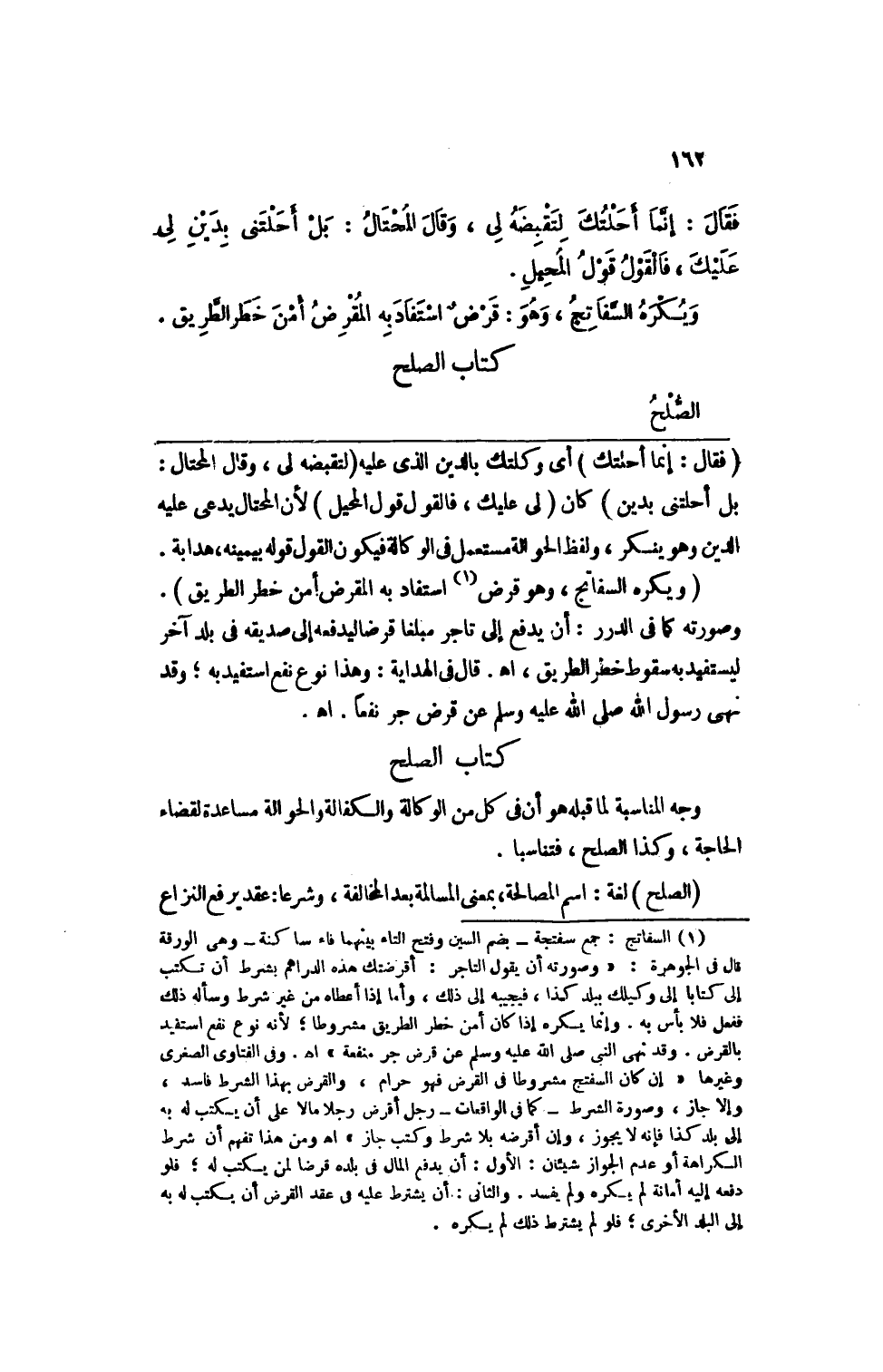 (¬1) السفاتج: جمع سفتجة - بضم السين وفتح التاء بينهما فاء ساكنة - وهي الروقة قال في الجوهرة: "وصورته أن يقول التاجر: أقرضتك هذه الدراهم بشرط أن تكتب إلي كتابا إلى وكيلك ببلد كذا، فيجيبه إلى ذلك، وأما إذا أعطاه من غير شرط وسأله ذلك ففعل فلا بأس به. وإنما يكره إذا كان أمن خطر الطريق مشروطا؛ لأنه نوع نفع استفيد بالقرض. وقد نهى النبي صلى الله عليه وسلم عن قرض جر منفعة" اهـ. وفي الفتاوى الصغرى وغيرها "إن كان السفتج مشروطاً في القرض فهو حرام، والقرض بهذا الشرط فاسد، وإلا جاز، وصورة الشرط - كما في الواقعات - رجل أقرض رجلا مالاً على أن يكتب له به إلى بلد كذا فإنه لا يجوز، وإن أقرضه بلا شرط وكتب جاز" اهـ ومن هذا تفهم أن شرط الكراهة أو عدم الجواز شيئان: الأول: أن يدفع المال في بلده قرضا لمن يكتب له؛ فلو دفعه إليه أمانة لم يكره ولم يفسد. والثاني: أن يشترط عليه في عقد القرض أن يكتب له به إلى البلد الأخرى؛ فلو لم يشترط ذلك لم يكره