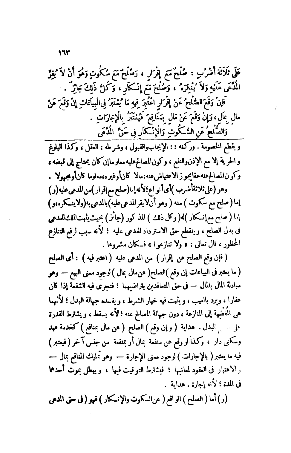 وهو (على ثلاثة أضرب) أي أنواع؛ لأنه إما (صلح مع إقرار) من المدعى عليه (و) إما (صلح مع سكوت) منه (وهو أن لا يقر المدعى عليه) بالمدعى به (ولا ينكره، و) إما (صلح مع إنكار) له (وكل ذلك) المذكور (جائز) بحيث يثبت الملك للمدعى في بدل الصلح، وينقطع حق الاسترداد للمدعى عليه؛ لأنه سبب لرفع التنازع المحظور، قال تعالى: {ولا تنازعوا} فكان مشروعا.
