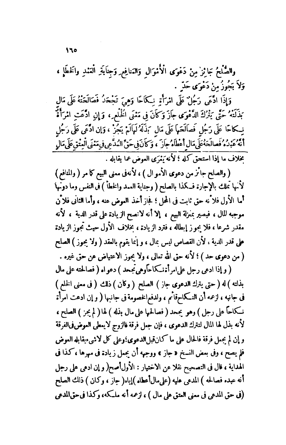 (والصلح جائز من دعوى الأموال) ، لأنه في معنى البيع كما مر (والمنافع) لأنها تملك بالإجارة فكذا بالصلح (وجناية العمد والخطأ) في النفس وما دونها أما الأول فلأنه حق ثابت في المحل؛ فجاز أخذ العوض عنه، وأما الثاني فلأن موجبه المال، فيصير بمنزلة البيع، إلا أنه لا تصح الزيادة على قدر الدية، لأنه مقدر شرعا، فلا يجوز إبطاله، فترد الزيادة، بخلاف الأول حيث تجوز الزيادة على قدر الدية، لأن القصاص ليس بمال، وإنما يقوم بالعقد (ولا يجوز) الصلح (من دعوى حد) ؛ لأنه حق الله تعالى، ولا يجوز الاعتياض عن حق غيره.