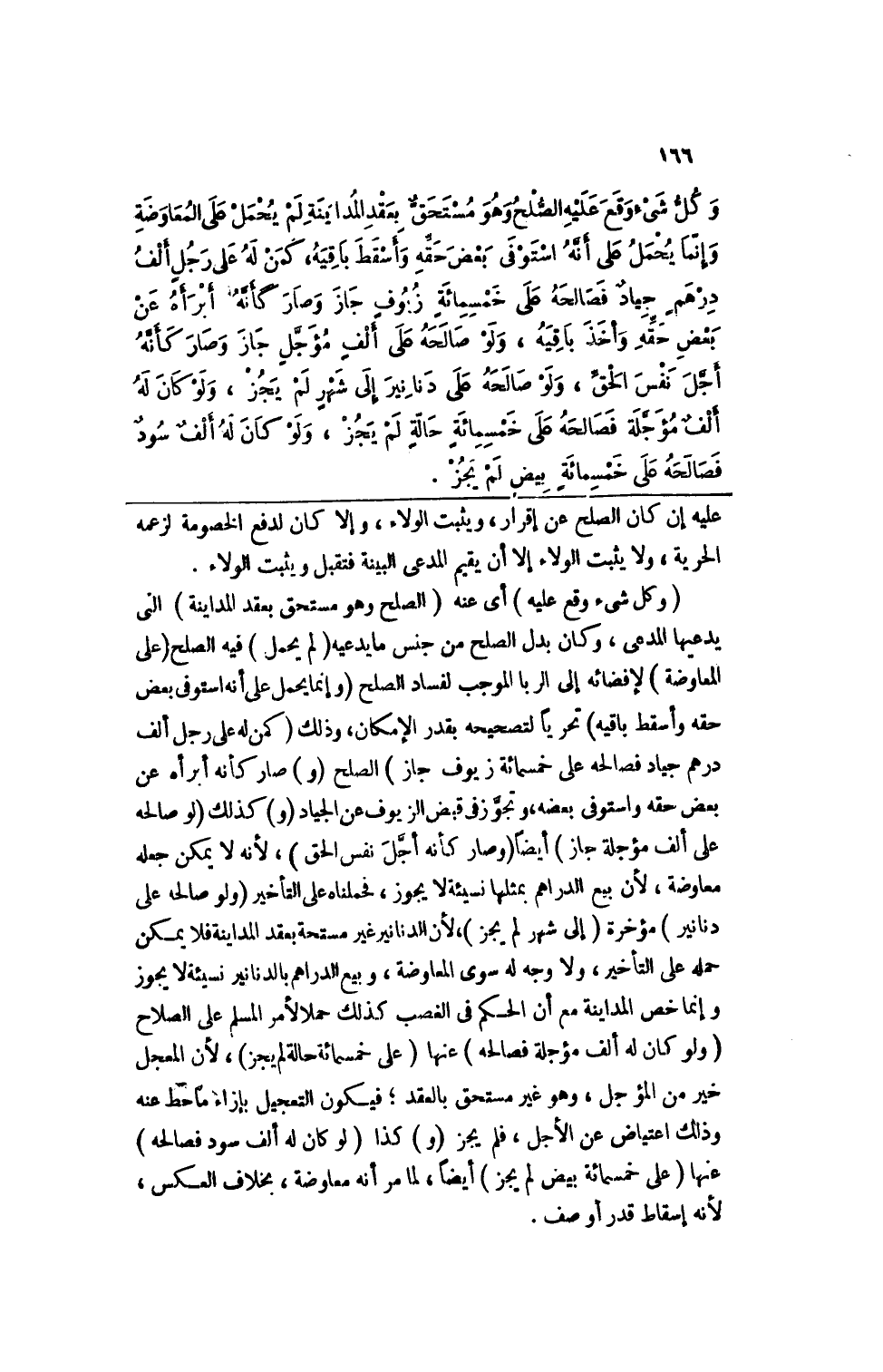 (وكل شيء وقع عليه) أي عنه (الصلح وهو مستحق بعقد المداينة) الني يدعيها المدعى، وكان بدل الصلح من جنس ما يدعيه (لم يحمل) فيه الصلح (على المعاوضة) لإفضائه إلى الربا الموجب لفساد الصلح (وإنما يحمل على أنه استوفى بعض حقه وأسقط باقيه) تحرياً لتصحيحه بقدر الإمكان، وذلك (كمن له على رجل ألف درهم جياد فصالحه على خمسمائة زيوف جاز) الصلح (و) صار كأنه أبرأه عن بعض حقه واستوفى بعضه، وتجوز في قبض الزيوف عن الجياد (و) كذلك (لو صالحه على ألف مؤجلة جاز) أيضاً (وصار كأنه أجل نفس الحق) ، لأنه لا يمكن جعله معاوضة، لأن بيع الدراهم بمثلها نسيئة لا يجوز، فحملناه لى التأخير (ولو صالحه على دنانير) مؤخرة (إلى شهر لم يجز) ، لأن الدنانير غير مستحقة بعقد المداينة فلا يمكن حمله على التأخير، ولا وجه له سوى المعاوضة، وبيع الدراهم بالدنانير نسيئة لا يجوز وإنما خص المداينة مع أن الحكم في الغصب كذلك حملا لأمر المسلم على الصلاح (ولو كان له ألف مؤجلة فصالحه) عنها (على خمسمائة حالة لم يجز) ، لأن المعجل خير من المؤجل، وهو غير مستحق بالعقد؛ فيكون التعجيل بإزاء ما حط عنه وذلك اعتياض عن الأجل، فلم يجز (و) كذا (لو كان له ألف سود فصالحه) عنها (على خمسمائة بيض لم يجز) أيضاً، لما مر أنه معاوضة، بخلاف العكس، لأنه إسقاط قدر أو صف