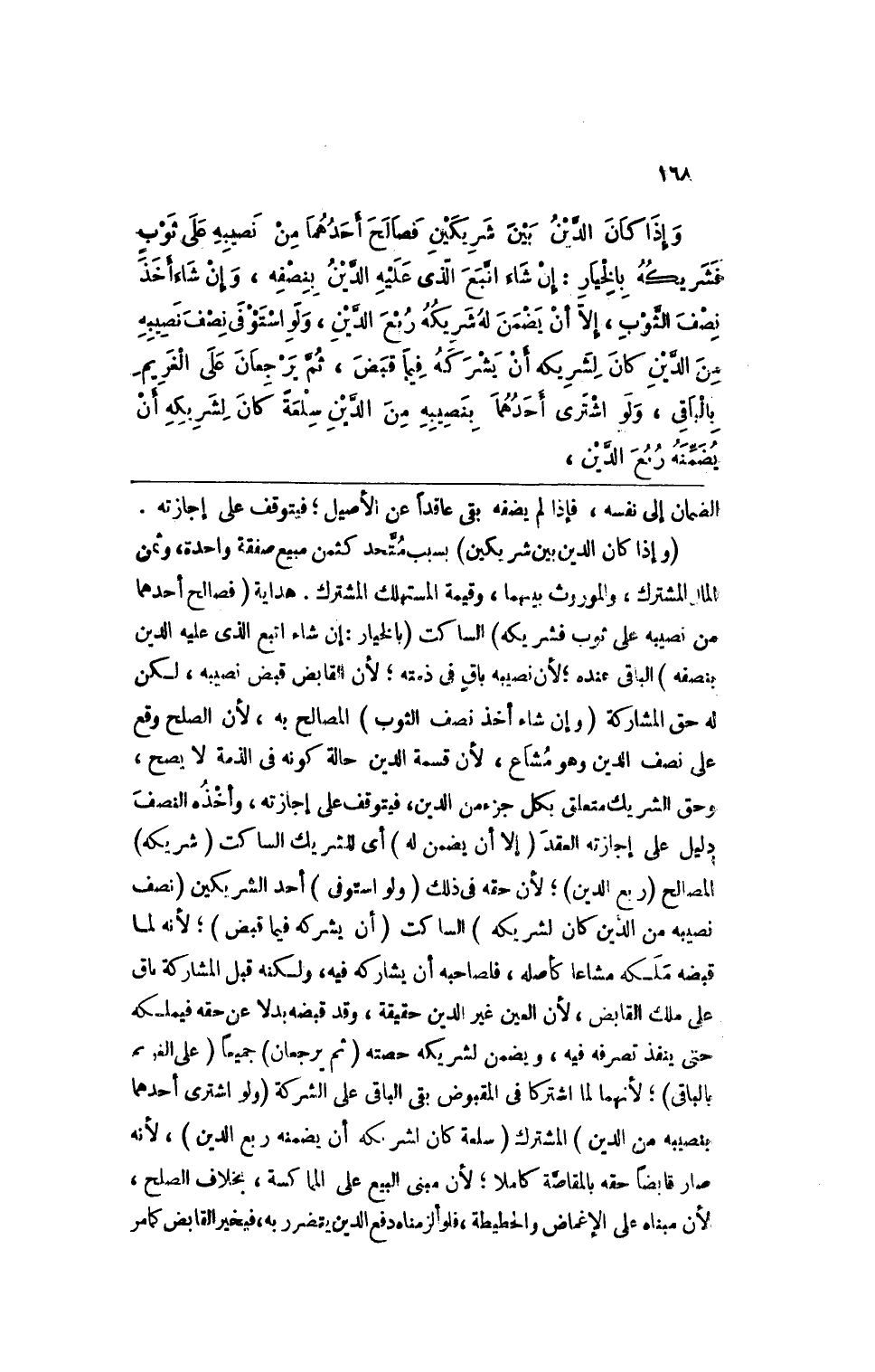 (وإذا كان الدين بين شريكين) بسبب متحد كثمن مبيع صفقة واحدة، وثمن المال المشترك، والموروث بينهما، وقيمة المستهلك المشترك. هداية (فصالح أحدهما من نصيبه على ثوب فشريكه) الساكت (بالخيار: إن شاء اتبع الذي عليه الدين بنصفه) الباقي عنده؛ لأن نصيبه باقٍ في ذمته؛ لأن القابض قبض نصيبه، لكن له حق المشاركة (وإن شاء أخذ نصف الثوب) المصالح به، لأن الصلح وقع على نصف الدين وهو مشاع، لأن قسمة الدين حالة كونه في الذمة لا يصح، وحق الشريك متعلق بكل جزء من الدين، فيتوقف على إجازته، وأخذه النصف دليل على إجازته العقد (إلا أن يضمن له) أي للشريك الساكت (شريكه) المصالح (ربع الدين) ؛ لأن حقه في ذلك (ولو استوفى) أحد الشريكين (نصف نصيبه من الذين كان لشريكه) الساكت (أن يشركه فيما قبض) ؛ لأنه لما قبضه ملكه مشاعا كأصله، فلصاحبه أن يشاركه فيه، ولكنه قبل المشاركة باق على ملك القابض، لأن العين غير الدين حقيقة، وقد قبضه بدلا عن حقه فيملكه حتى ينفذ تصرفه فيه، ويضمن لشريكه حصته (ثم يرجعان) جميعاً (على الغريم بالباقي) ؛ لأنهما لما اشتركا في المقبوض بقي الباقي على الشركة (ولو اشترى أحدهما بنصيبه من الدين) المشترك (سلعة كان لشريكه أن يضمنه ربع الدين) ، لأنه صار قابضاً حقه بالمقاصة كاملا؛ لأن مبنى البيع على المماكسة، بخلاف الصلح، لأن مبناه على الإغماض والحطيطة، فلو ألزمناه دفع الدين يتضرر به، فيخير القابض كما مر