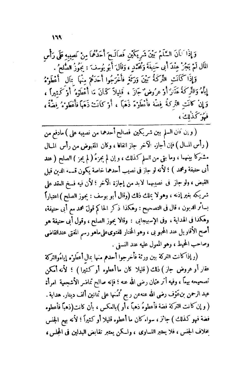 (وإذا كانت التركة بين ورثة فأخرجوا أحدهم منها بمالٍ أعطوه إياه والتركة عقاراً وعروض جاز) ذلك (قليلا كان ما أعطوه أو كثيرا) ؛ لأنه أمكن تصحيحه بيعاً، وفيه أثر عثمان رضي الله عنه؛ فإنه صالح تماضر الأشجعية امرأة عبد الرحمن بن عوف رضي الله عنه عن ربع ثمنها على ثمانين ألف دينار. هداية. (وإن كانت التركة فضة فأعطوه ذهباً، أو) بالعكس، بأن كانت (ذهباً فأعطوه فضة فهو كذلك) جائز، سواء كان ما أعطوه قليلا أو كثيراً؛ لأن بيع الجنس بخلاف الجنس، فلا يعتبر التساوي، ولكن يعتبر تقابض البدلين في المجلس،