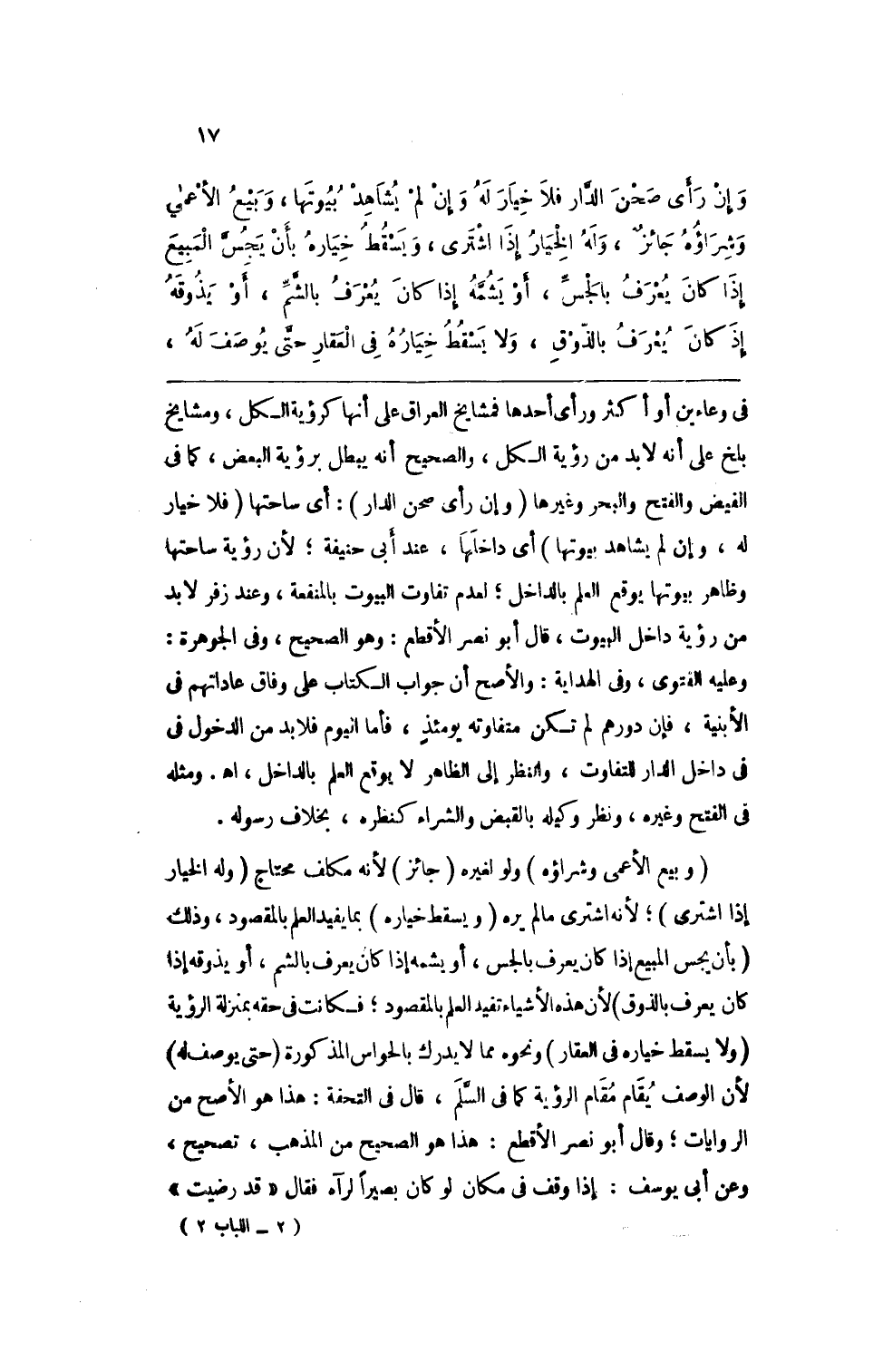 في وعاءين أو أكثر ورأى أحدها فمشايخ العراق على أنها كرؤية الكل ومشايخ بلخ على أنه لا بد من رؤية الكل، والصحيح أنه يبطل برؤية البعض كما في الفيض والفتح والبحر وغيرها (وإن رأى صحن الدار) : أي ساحتها (فلا خيار له وإن لم يشاهد بيوتها) . أي داخلها عند أبي حنيفة؛ لأن رؤية ساحتها وظاهر بيوتها يوقع العلم بالداخل؛ لعدم تفاوت البيوت بالمنفعة، وعند زفر لابد من رؤية داخل البيوت، قال أبو نصر الأقطع؛ وهو الصحيح، وفي الجوهرة: وعليه الفتوى: وفي الهداية، والأصح أن جواب الكتاب على وفق عادتهم في الأبنية فإن دورهم لم تكن متفاوتة يومئذ فأما اليوم فلابد من الدخول في داخل الدار للتفاوت والنظر إلى الظاهر لا يوقع العلم بالداخل اهـ ومثله في الفتح وغيره، ونظر وكيله بالقبض والشراء كنظره، بخلاف رسوله. (وبيع الأعمى وشراؤه) ولو لغيره (جائز) لأنه مكلف محتاج (وله الخيار إذا اشترى) ، لأنه اشترى ما لم يره (ويسقط خياره) بما يفيد العلم بالمقصود، وذلك (بأن يجس المبيع إذا كان يعرف بالجس، أو يشمه إذا كان يعرف بالشم، أو يذوقه إذا كان يعرف بالذوق) لأن هذه الأشياء تفيد العلم بالمقصود، فكانت في حقه بمنزلة الرؤية (ولا يسقط خياره في العقار) ونحوه مما لا يدرك بالحواس المذكورة (حتى يوصف له) لأن الوصف يقام مقام الرؤية كما في السلم، قال في التحفة: هذا هو الأصح من الروايات، وقال أبو نصر الأقطع: هذا هو الصحيح من المذهب، تصحيح، وعن أبي يوسف: إذا وقف في مكان لو كان بصيراً لرآه فقال " قد رضيت"