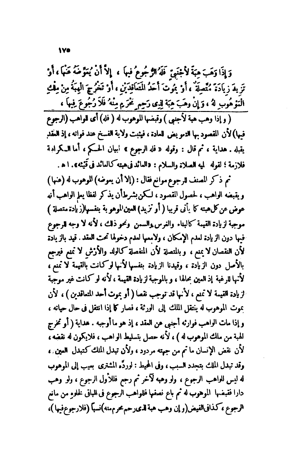 (ثم ذكر المصنف للرجوع موانع فقال: (إلا أن يعوضه) الموهوب له (عنها) ويقبضه الواهب، لحصول المقصود، لكن بشرط أن يذكر لفظا يعلم الواهب أنه عوض عن كل هبته كما يأتي قريبا (أو تزيد) العين الموهوبة بنفسها (زيادة متصلة) موجبة لزيادة القيمة كالبناء والغرس والسمن ونحو ذلك، لأنه لا وجه للرجوع فيها دون الزيادة لعدم الإمكان، ولا معها لعدم دخولها تحت العقد. قيد بالزيادة لأن النقصان لا يمنع، وبالمتصلة لأن المنفصلة كالولد والأرش لا تمنع فيرجع بالأصل دون الزيادة، وقيدنا الزيادة بنفسها لأنها لو كانت بالقيمة لا تمنع، لأنها للرغبة إذ العين بحالها، وبالموجبة لزيادة القيمة، لأنه لو كانت غير موجبة لزيادة القيمة لا تمنع، لأنها قد توجب نقصا (أو يموت أحد المتعاقدين) ، لأن بموت الموهوب له ينتقل الملك إلى الورثة، فصار كما إذا انتقل في حال حياته، وإذا مات الواهب فوارثه أجنبي عن العقد، إذ هو ما أوجبه. هداية (أو تخرج الهبة من ملك الموهوب له) ، لأنه حصل بتسليط الواهب، فلا يكون له نقضه، لأن نقض الإنسان ما تم من جهته مردود، ولأن تبدل الملك كتبدل العين، وقد تبدل الملك بتجدد السبب، وفي المحيط: لو رده المشتري بعيب إلى الموهوب له ليس للواهب الرجوع، ولو وهبه لآخر ثم رجع فللأول الرجوع، لو وهب دارا فقبضها الموهوب له ثم باع نصفها فللواهب الرجوع في الباقي لخلوه من مانع الرجوع، كذا في الفيض (وإن وهب هبة لذي رحم محرم منه) نسباً (فلا رجوع فيها) ،