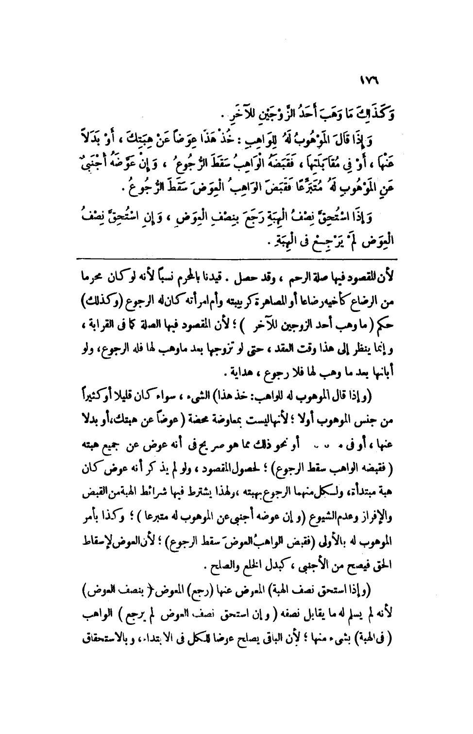 لأن المقصود فيها صلة الرحم، وقد حصل. قيدنا بالمحرم نسباً لأنه لو كان محرما من الرضاع كأخيه رضاعا أو المصاهرة كربيبته وأم امرأته كان له الرجوع (وكذلك) حكم (ما وهب أحد الزوجين للآخر) ؛ لأن المقصود فيها الصلة كما في القرابة، وإنما ينظر إلى هذا وقت العقد، حتى لو تزوجها بعدما وهب لها فله الرجوع، ولو أبانها بعد ما وهب لها فلا رجوع، هداية.