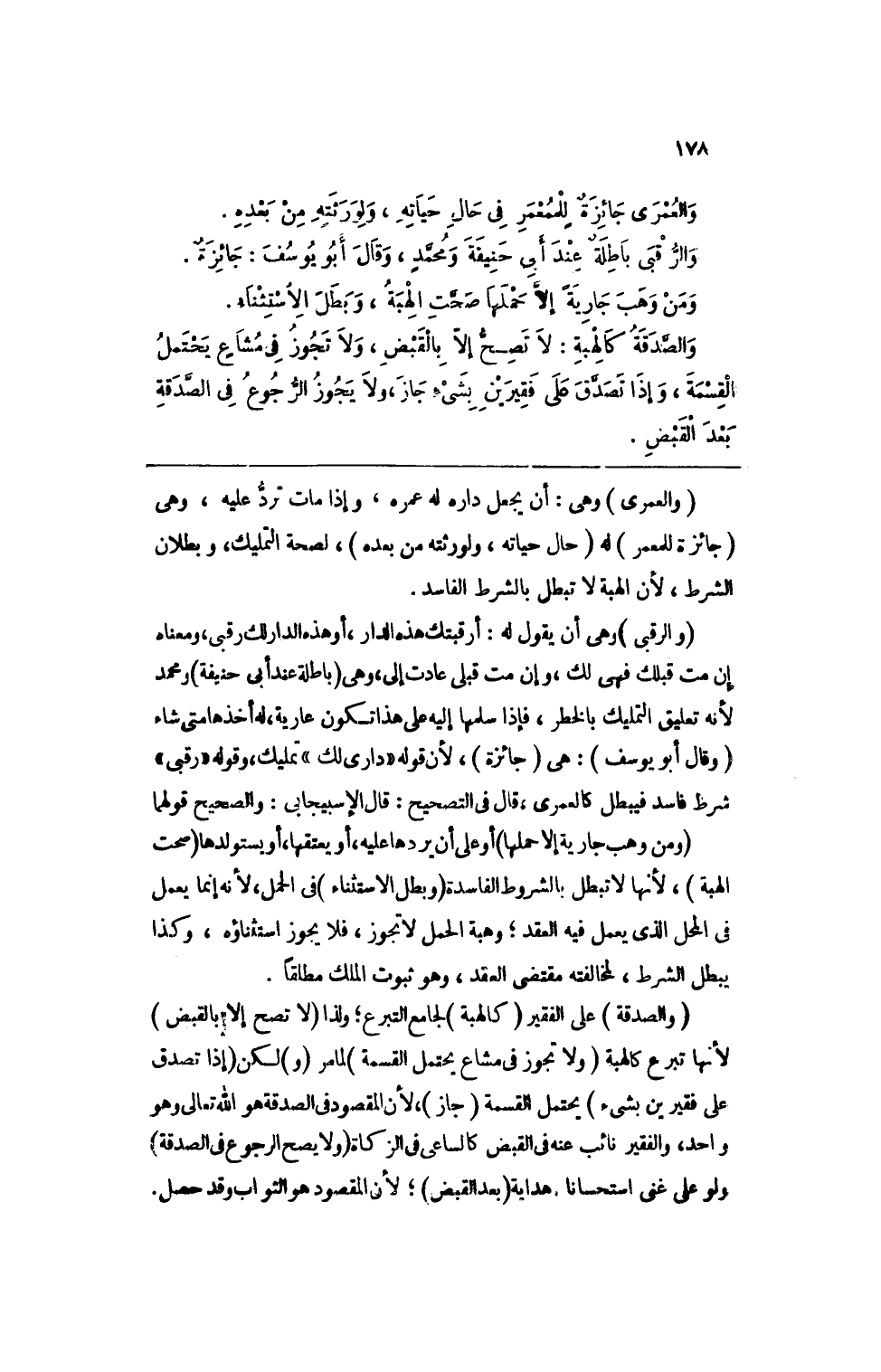 (والعمرى) وهي: أن يجعل داره له عمره، وإذا مات ترد عليه، وهي (جائزة للمعمر) له (حال حياته، ولورثته من بعده) ، لصحة التمليك، وبطلان الشرط، لأن الهبة لا تبطل بالشرط الفاسد.