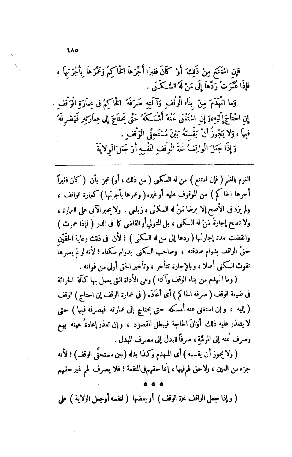 (وما انهدم من بناء الوقف وآلته) وهي الأداة التي يعمل بها كآلة الحراثة في ضيعة الوقف (صرفه الحاكم) أي أعاده (في عمارة الوقف إن احتاج) الوقف (إليه، وإن استغنى عنه أمسكه حتى يحتاج إلى عمارته فيصرفه فيها) حتى لا يتعذر عليه ذلك أو أن الحاجة فيبطل المقصود، وإن تعذر إعادة عينه بيع وصرف ثمنه إلى المرمة، صرفاً للبدل إلى مصرف البدل.