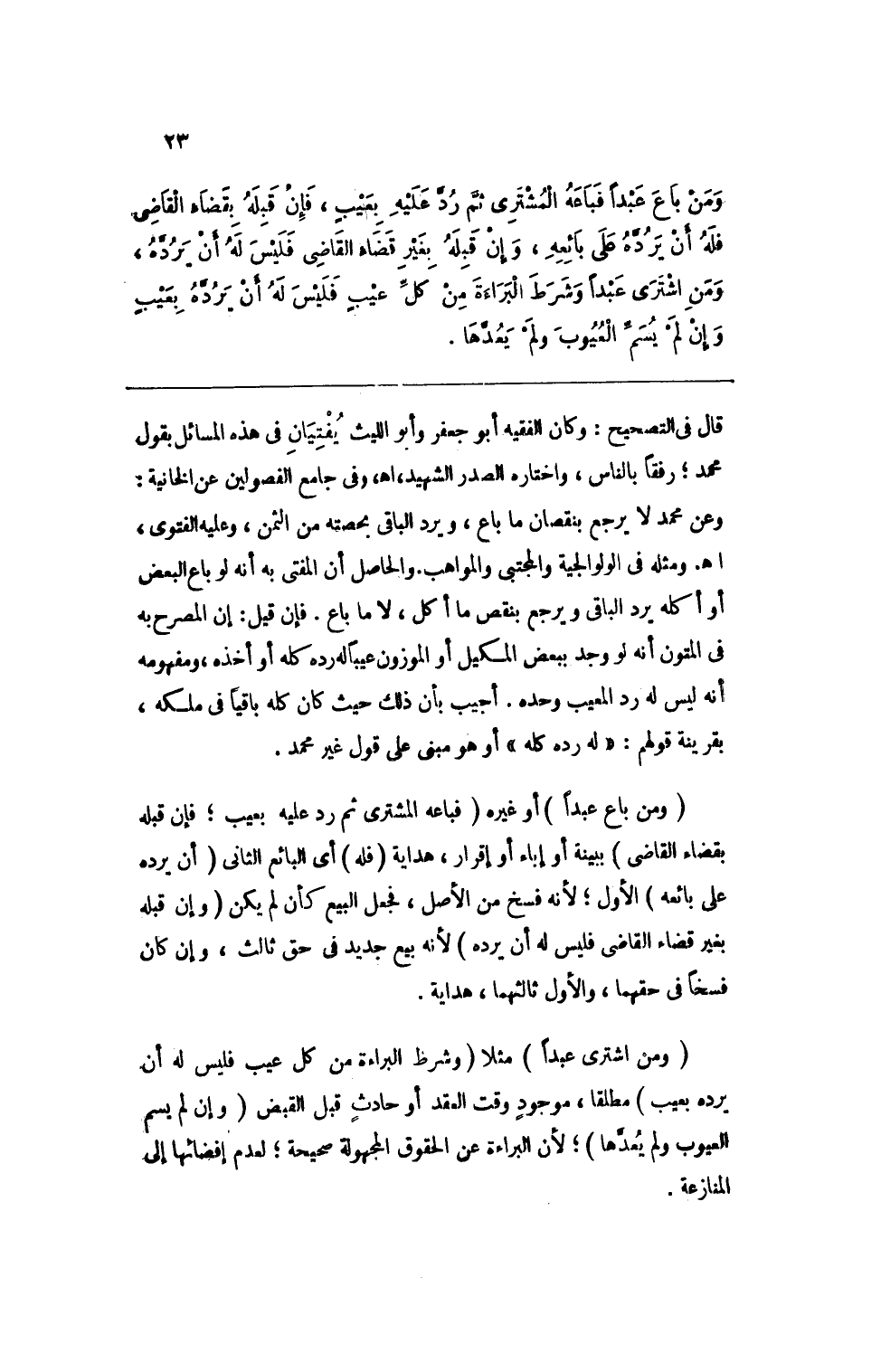 قال في التصحيح: وكان الفقيه أبو جعفر وأبو الليث يفتيان في هذه المسائل بقول محمد رفقاً بالناس، واختاره الصدر الشهيد اهـ. وفي جامع الفصولين عن الخانية: وعن محمد لا يرجع بنقصان ما باع ويرد الباقي بحصته من الثمن، وعليه الفتوى. اهـ. ومثله الولوالجية والمجتبى والمواهب. والحاصل أن المفتى به أنه لو باع البعض أو أكله يرد الباقي ويرجع بنقصان ما أكل، لا ما باع. فإن قيل: إن المصرح به في المتون أنه لو وجد ببعض المكيل أو الموزون عيباً له رده كله أو أخذه، ومفهومه أنه ليس له رد المعيب وحده. أجيب بأن ذاك حيث كان كله باقيا في ملكه، بقرينة قولهم: " له رده كله" أو هو مبني على قول غير محمد.