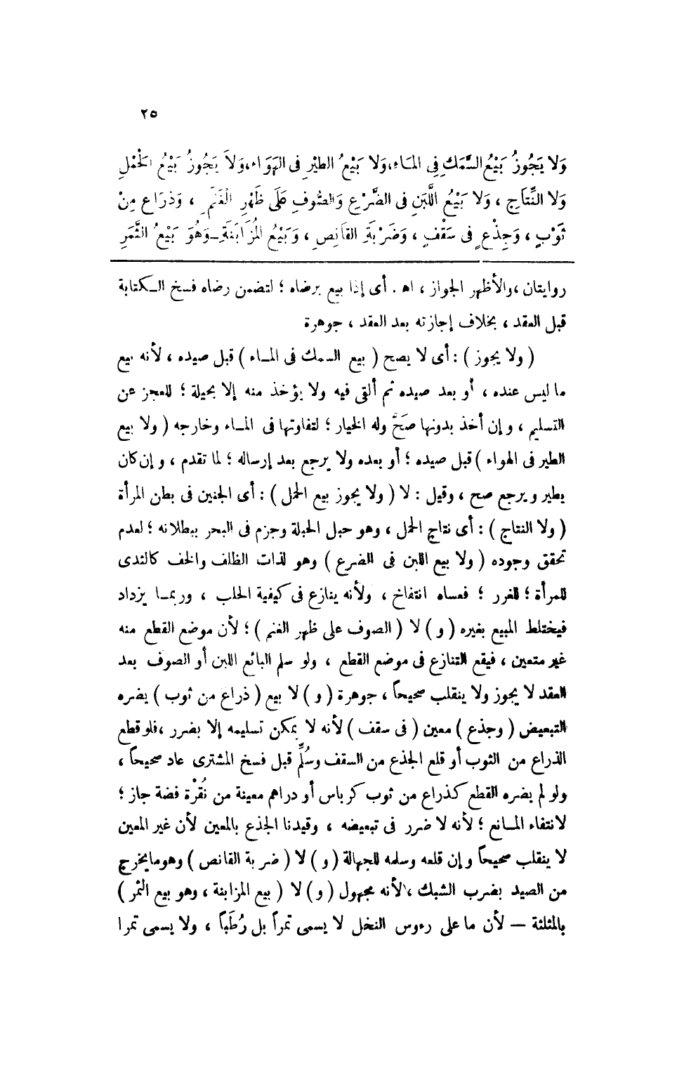ولا يجوز بيع السمك في الماء، ولا بيع الطير في الهواء؛ ولا يجوز بيع الحمل ولا النتاج، ولا بيع اللبن في الضرع والصوف على ظهر الغنم، وذراعٍ من ثوبٍ، وجذعٍ في سقفٍ، وضربة الغائص، وبيع المزابنة وهو بيع الثمر