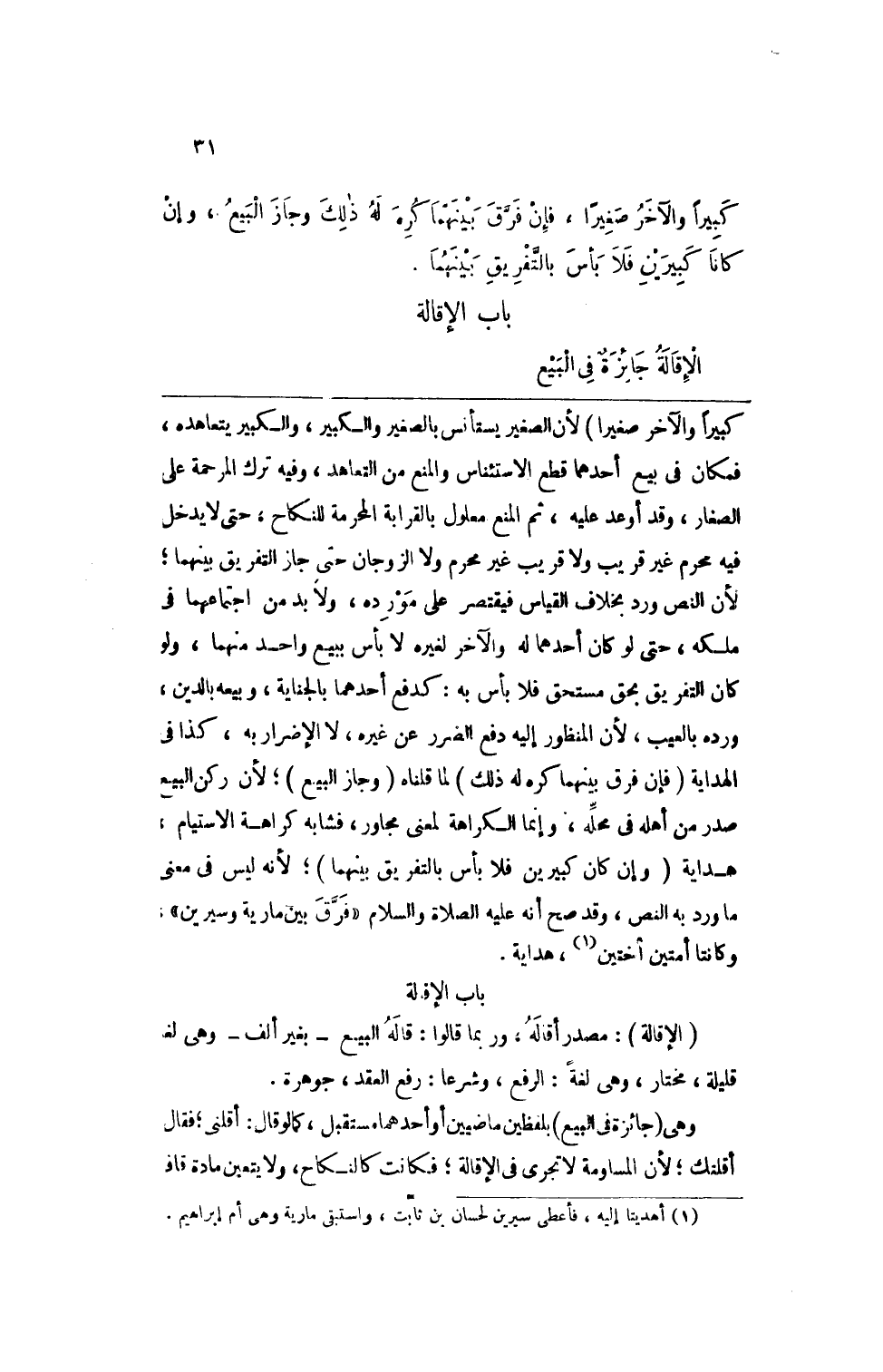 كبيراً والآخر صغيراً) لأن الصغير يستأنس بالصغير والكبير، والكبير يتعاهده، فكان في بيع أحدهما قطع الاستئناس والمنع من التعاهد، وفيه ترك المرحمة على الصغار، وقد أوعد عليه، ثم المنع معلول بالقرابة المحرمة للنكاح حتى لا يدخل فيه محرم غير قريب ولا قريب غير محرم ولا الزوجان حتى جاز التفريق بينهما، لأن النص ورد بحلاف القياس فيقتصر على مورده، ولابد من اجتماعهما بحق مستحق في ملكه حتى لو كان أحدهما له والآخر لغيره لا بأس ببيع واحد منهما، ولو كان التفريق فلا بأس به: كدفع أحدهما بالجناية، وبيعه بالدين، ورده بالعيب، لأن المنظور إليه دفع الضرر عن غيره لا الإضرار به، كذا في الهداية (فإن فرق بينهما كره له ذلك) لما قلنا (وجاز البيع) ، لأن ركن البيع صدر من أهله في محله، وإنما الكراهة لمعنى مجاور فشابه كراهة الاستيام. هداية. (وإن كان كبيرين فلا بأس بالتفريق بينهما) لأنه ليس في معنى ما ورد به النص، وقد صح أنه عليه الصلاة والسلام فرق بين مارية وسيرين، وكانتا أمتين أختين. هداية.