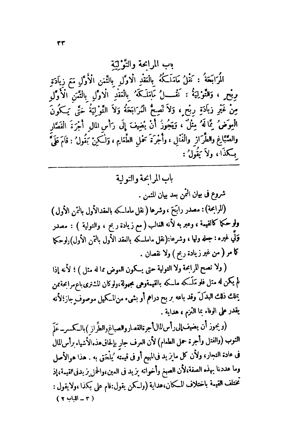 - المرابحة: نقل ما ملكه بالعقد الأول بالثمن الأول مع زيادة ربحٍ. والتولية: نقل ما ملكه بالعقد الأول بالثمن الأول من غير زيادة ربحٍ.