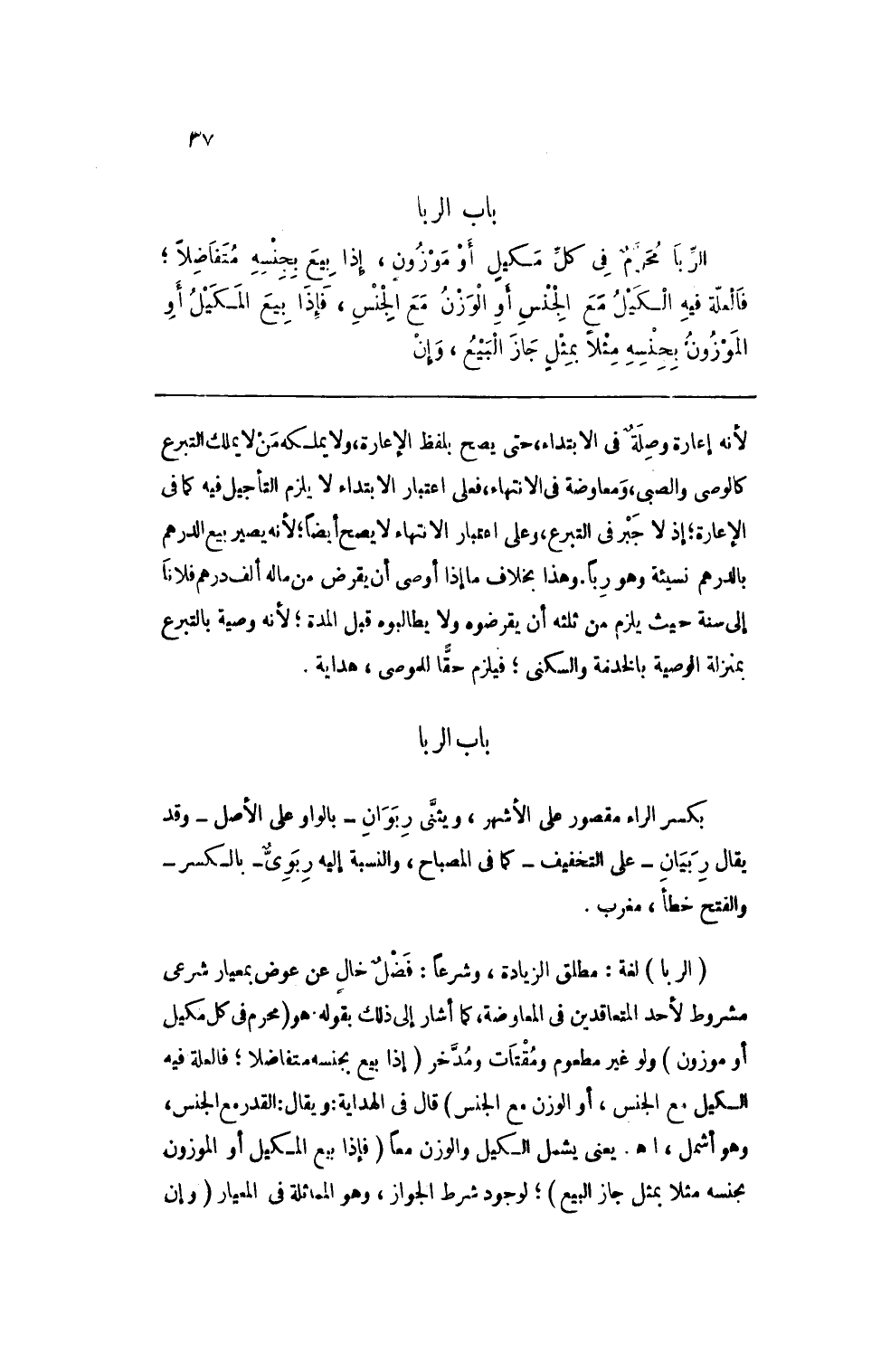 (الربا) لغة: مطلق الزيادة، وشرعاً: فضل خال عن عوض بمعيار شرعي مشروط لأحد المتعاقدين في المعاوضة، كما أشار إلى ذلك بقوله: هو (محرم في كل مكيل أو موزون) ولو غير مطعوم ومقتات ومدخر (إذا بيع بجنسه متفاضلا؛ فالعلة فيه الكيل مع الجنس، أو الوزن مع الجنس) قال في الهداية: ويقال: القدر مع الجنس، وهو أشمل. اهـ. يعني يشمل الكيل والوزن معاً (فإذا بيع المكيل أو الموزون بجنسه مثلا بمثل جاز البيع) : لوجود شرط الجواز، وهو المماثلة في المعيار (وإن