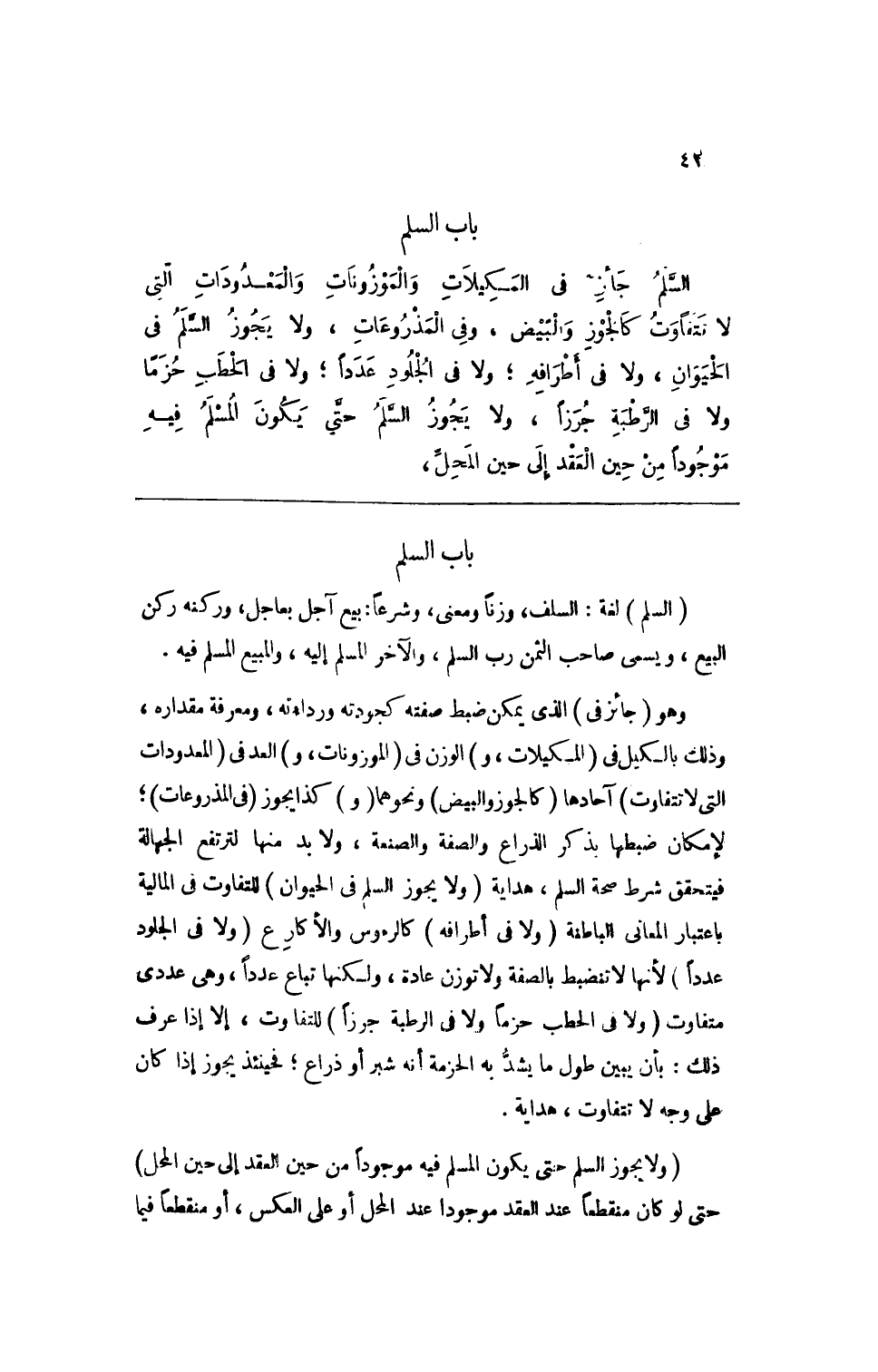 - السلم جائزٌ (¬1) في المكيلات والموزونات والمعدودات التي لا تتفاوت كالجوز والبيض، وفي المذروعات، ولا يجوز السلم في الحيوان، ولا في أطرافه، ولا في الجلود عدداً، ولا في الحطب حزماً، ولا في الرطبة جرزاً.