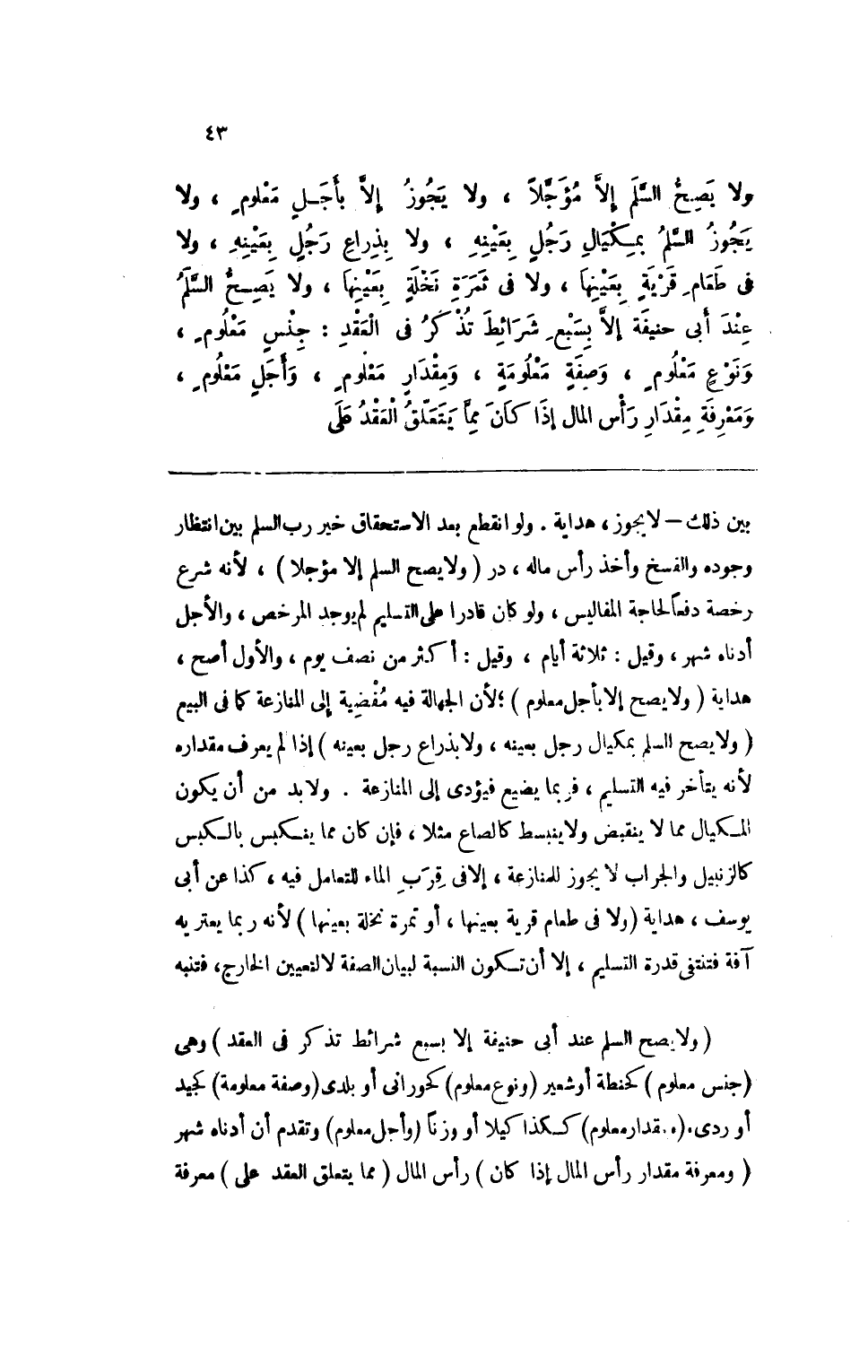 ولا يصح السلم عند أبي حنيفة إلا بسبع شرائط تذكر في العقد: جنسٍ معلومٍ، ونوعٍ معلومٍ، وصفةٍ معلومةٍ، ومقدارٍ معلومٍ، وأجلٍ معلومٍ، ومعرفة مقدار رأس المال إذا كان مما يتعلق العقد على
