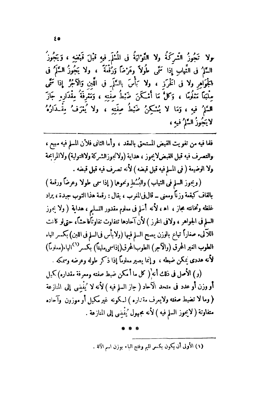 (و) الأصل في ذلك أنه (كل ما أمكن ضبط صفته ومعرفة مقداره) بكيل أو وزن أو عدد في متحد الآحاد (جاز السلم فيه) ، لأنه لا يفضي إلى المنازعة (وما لا تضبط صفته ولا يعرف مقداره) لكونه غير مكيل وموزون وآحاده متفاوتة (لا يجوز السلم فيه) لأنه مجهول يفضي إلى المنازعة