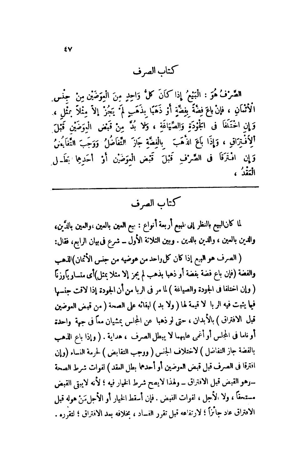 (الصرف هو البيع إذا كان كل واحد من عوضيه من جنس الأثمان) الذهب والفضة (فإن باع فضة بفضة أو ذهبا بذهب لم يجز إلا مثلا بمثل) : أي متساوياً وزناً (وإن اختلفا في الجودة والصياغة) لما مر في الربا من أن الجودة إذا لاقت جنسها فيما يثبت فيه الربا لا قيمة لها (ولابد) لبقائه على الصحة (من قبض العوضين قبل الافتراق) بالأبدان، حتى لو ذهبا عن المجلس يمشيان معا في جهة واحدة أو ناما في المجلس أو أغمي عليهما لا يبطل الصرف. هداية (وإذا باع الذهب بالفضة جاز التفاضل) لاختلاف الجنس (ووجب التقابض) لحرمة النساء (وإن افترقا في الصرف قبل قبض العوضين أو أحدهما بطل العقد) لفوات شرط الصحة - وهو القبض قبل الافتراق - ولهذا لا يصح شرط الخيار فيه؛ لأنه لا يبقى القبض مستحقا، ولا الأجل، لفوات القبض. فإن أسقط الخيار أو الأجل من هو له قبل الافتراق عاد جائزاً؛ لارتفاعه قبل تقرر الفساد، بخلافه بعد الافتراق؛ لتقرره.