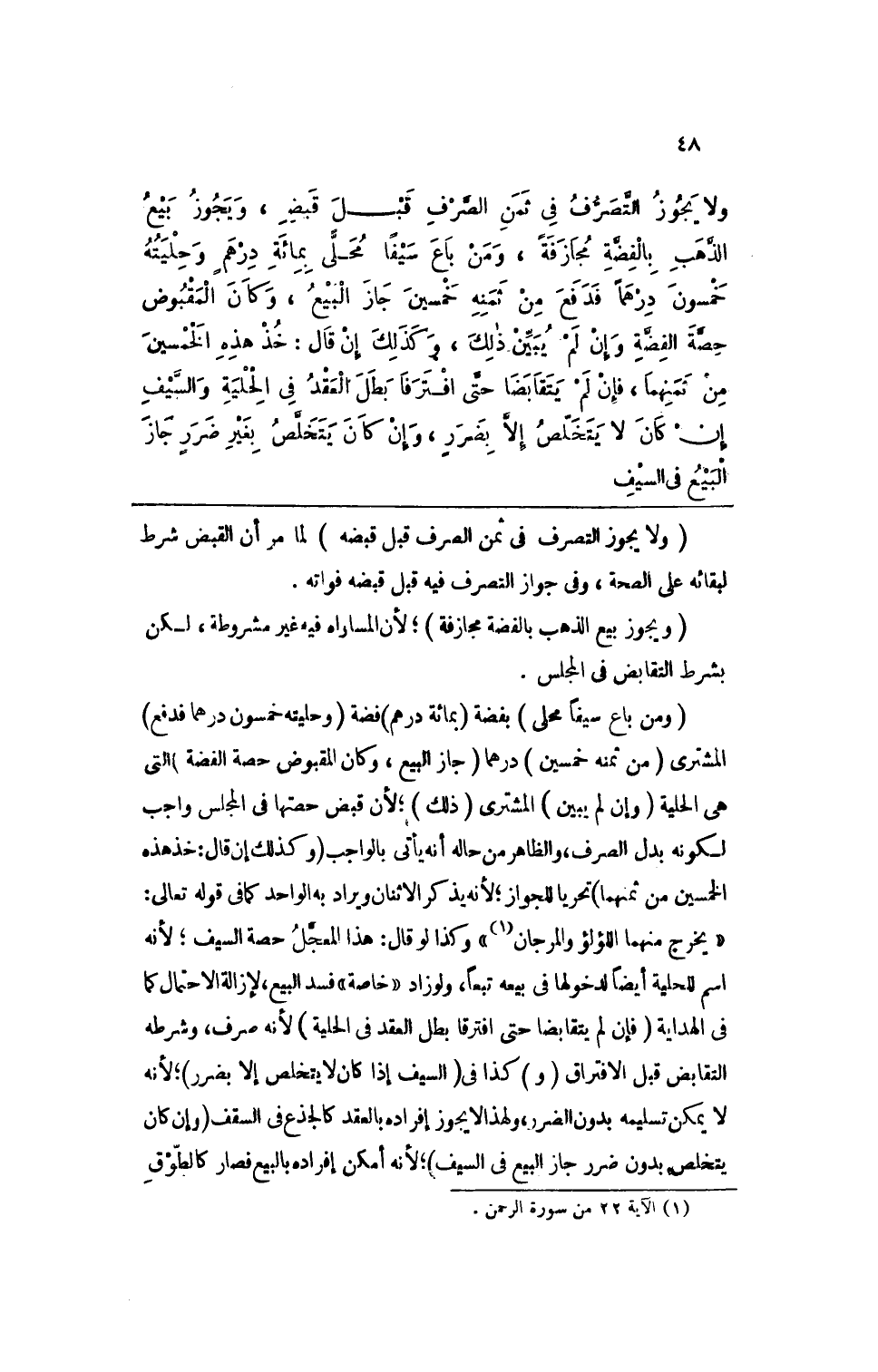 ومن باع سيفاً محلى بمائة درهمٍ وحليته خمسون درهماً فدفع من ثمنه خمسين جاز البيع، وكان المقبوض حصة الفضة وإن لم يبين ذلك، وكذلك إن قال: خذ هذه الخمسين من ثمنهما، فإن لم يتقابضا حتى افترقا بطل العقد في الحلية والسيف إن كان لا يتخلص إلا بضررٍ، وإن كان يتخلص بغير ضررٍ جاز البيع في السيف