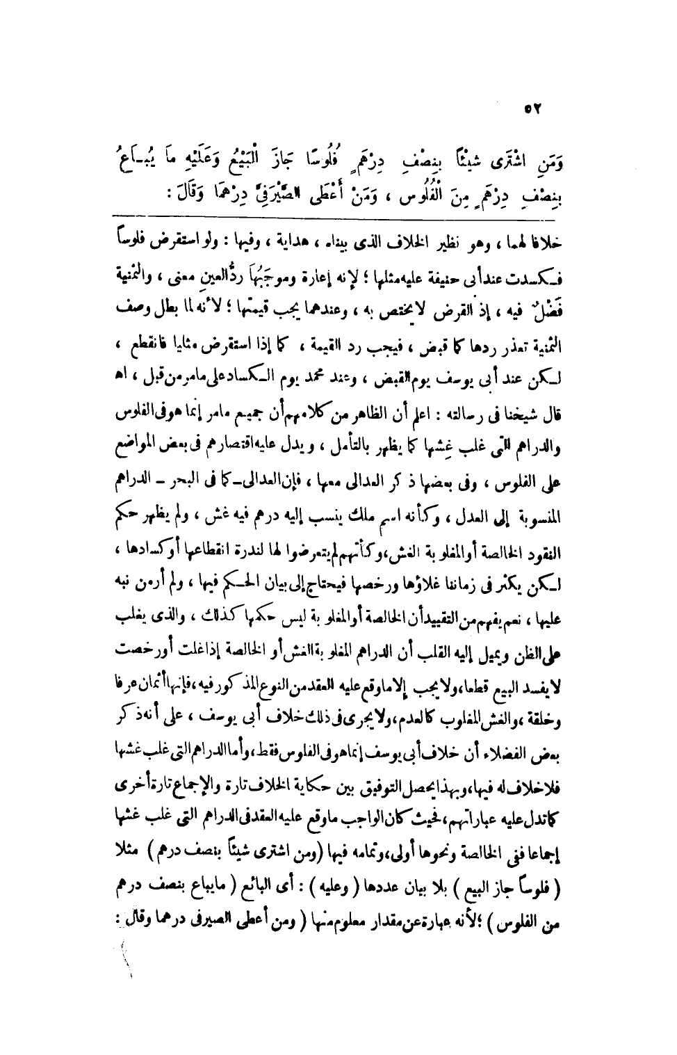 ومن اشترى شيئاً بنصف درهمٍ فلوساً جاز البيع وعليه ما يباع بنصف درهمٍ من الفلوس، ومن أعطى الصيرفي درهماً وقال: