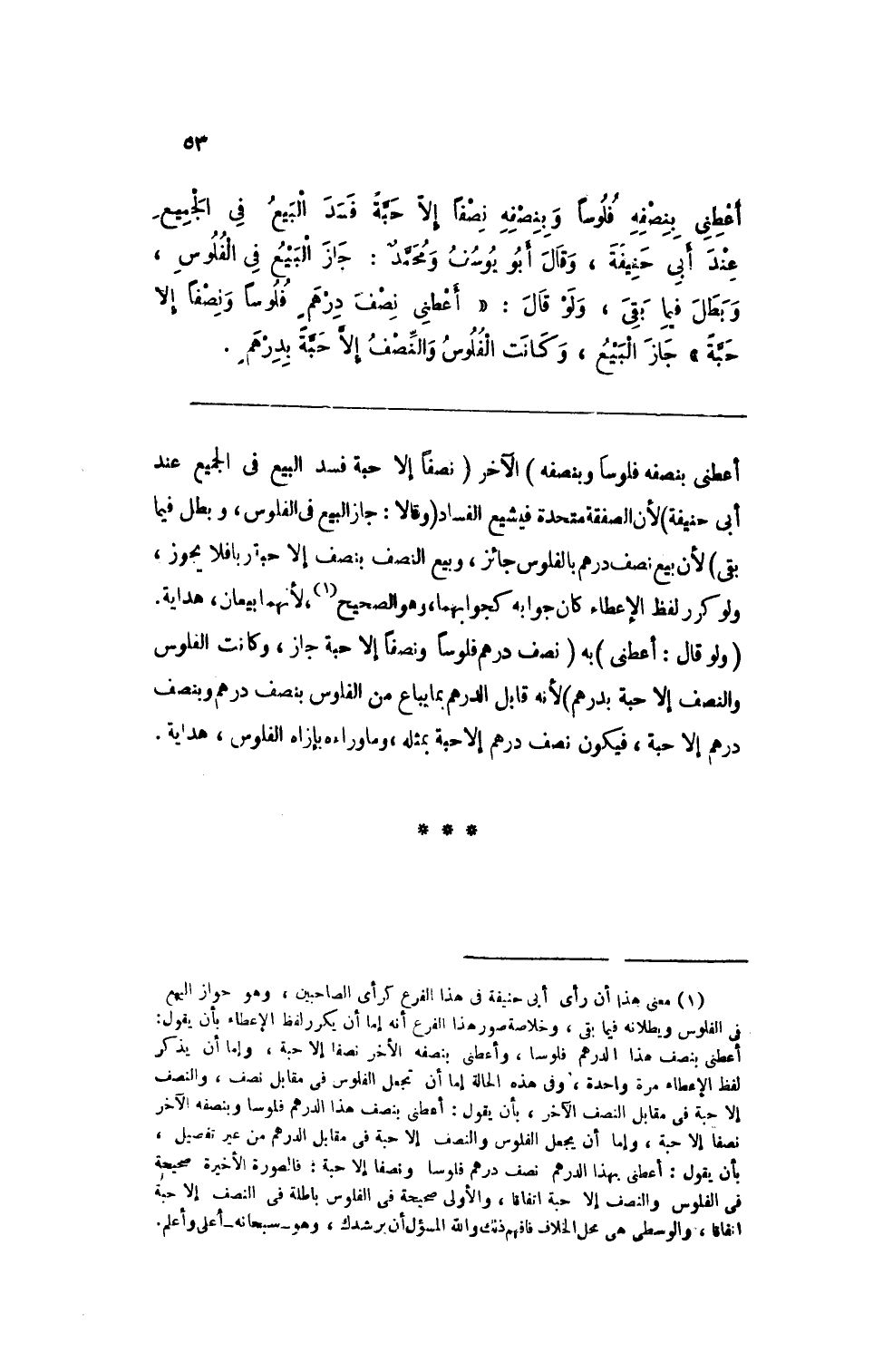 ولو قال (أعطني نصف درهم فلوساً ونصفاً إلا حبةً) جاز البيع وكانت الفلوس والنصف إلا حبةً بدرهمٍ.