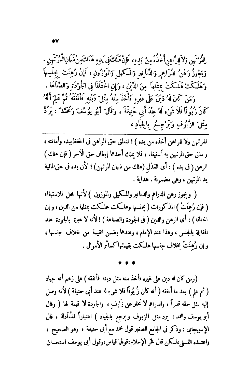 (ويجوز رهن الدراهم والدنانير والمكيل والموزون) لأنها محل للاستيفاء (فإن رهنت) المذكورات (بجنسها وهلكت هلكت بمثلها من الدين، وإن اختلفا) : أي الرهن والدين (في الجودة والصناعة) ؛ لأنه لا عبرة بالجودة عند المقابلة بالجنس، وهذا عند الإمام، وعندهما يضمن القيمة من خلاف جنسها، وإن رهنت بخلاف جنسها هلكت بقيمتها كسائر الأموال.