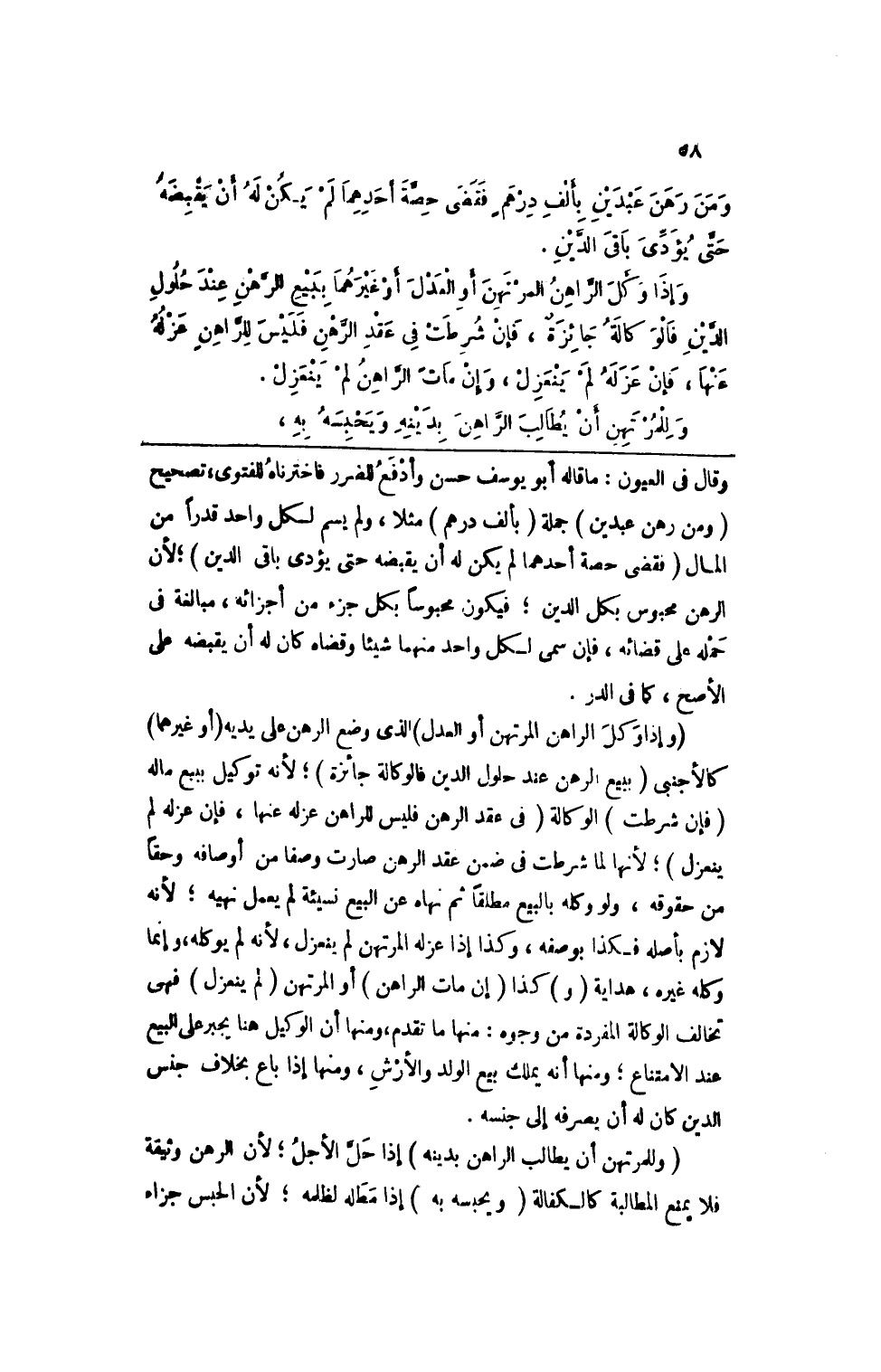 (وإذا وكل الراهن المرتهن أو العدل) الذي وضع الرهن على يديه (أو غيرهما) كالأجنبي (ببيع الرهن عند حلول الدين فالوكالة جائزة) ؛ لأنه توكيل ببيع ماله (فإن شرطت) الوكالة (في عقد الرهن فليس للراهن عزله عنها، فإن عزله لم ينعزل) ؛ لأنها لما شرطت في ضمن عقد الرهن صارت وصفا من أوصافه وحقاً من حقوقه، ولو وكله بالبيع مطلقاً ثم نهاه عن البيع نسيئة لم يعمل نهيه؛ لأنه لازم بأصله فكذا بوصفه، وكذا إذا عزله المرتهن لم ينعزل، لأنه لم يوكله، وإنما وكله غيره، هداية (و) كذا (إن مات الراهن) أو المرتهن (لم ينعزل) فهي تخالف الوكالة المفردة من وجوه: منها ما تقدم، ومنها أن الوكيل هنا يجبر على البيع عند الامتناع؛ ومنها أنه يملك بيع الولد والأرش، ومنها إذا باع بخلاف جنس الدين كان له أن يضرفه إلى جنسه.