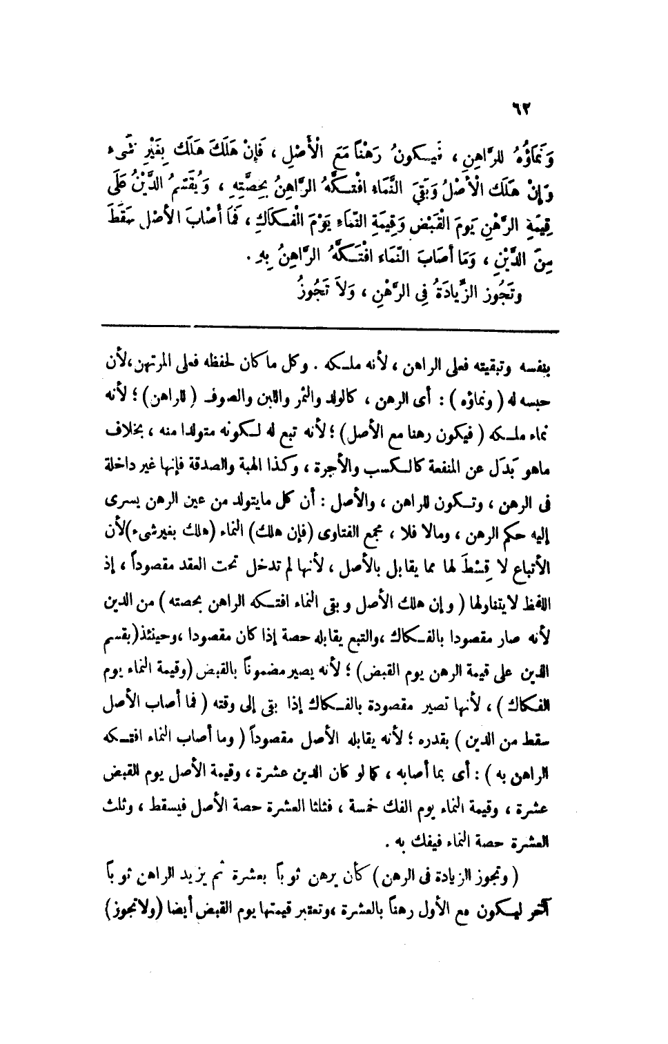 بنفسه وتبقيته فعلى الراهن، لأنه ملكه. وكل ما كان لحفظه فعلى المرتهن، لأن حبسه له (ونماؤه) : أي الرهن، كالولد والثمر واللبن والصوف (للراهن) ؛ لأنه نماء ملكه (فيكون رهنا مع الأصل) ؛ لأنه تبع له لكونه متولدا منه، بخلاف ما هو بدل عن المنفعة كالكسب والأجرة، وكذا الهبة والصدقة فإنها غير داخلة في الرهن، وتكون للراهن، والأصل: أن كل ما يتولد من عين الرهن يسري إليه حكم الرهن، وما لا فلا، مجمع الفتاوى (فإن هلك) النماء (هلك بغير شيء) لأن الأتباع لا قسط لها مما يقابل بالأصل، لأنها لم تدخل تحت العقد مقصوداً، إذ اللفظ لا يتناولها (وإن هلك الأصل وبقي النماء افتكه الراهن بحصته) من الدين لأنه صار مقصودا بالفكاك، والتبع يقابله حصة إذا كان مقصودا، وحينئذ (يقسم الدين على قيمة الرهن يوم القبض) ؛ لأنه يصير مضموناً بالقبض (وقيمة النماء يوم الفكاك) ، لأنها تصير مقصودة بالفكاك إذا بقي إلى وقته (فما أصاب الأصل سقط من الدين) بقدره؛ لأنه يقابله الأصل مقصوداً (وما أصاب النماء افتكه الراهن به) : أي بما أصابه، كما لو كان الدين عشرة، وقيمة الأصل يوم القبض عشرة، وقيمة النماء يوم الفك خمسة، فثلثا العشرة حصة الأصل فيسقط، وثلث العشرة حصة النماء فيفك به.