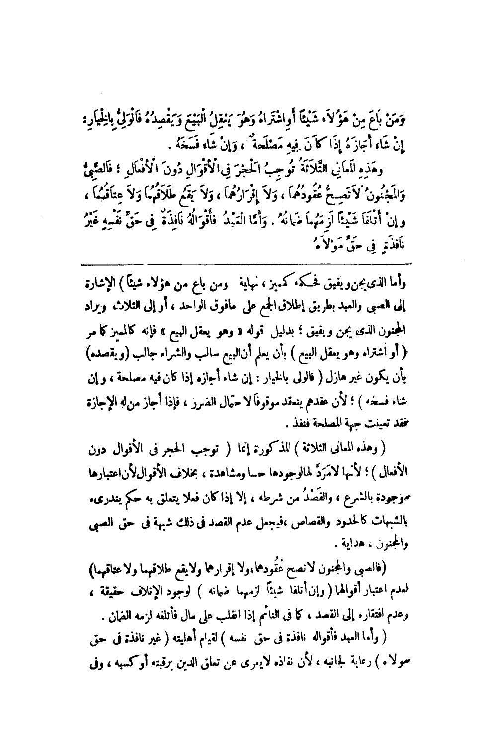 وهذه المعاني الثلاثة توجب الحجر في الأقوال دون الأفعال؛ فالصبي والمجنون لا تصح عقودهما، ولا إقرارهما، ولا يقع طلاقهما ولا عتاقهما، وإن أتلفا شيئاً لزمهما ضمانه. وأما العبد فأقواله نافذةٌ في حق نفسه غير نافذةٍ في حق مولاه.