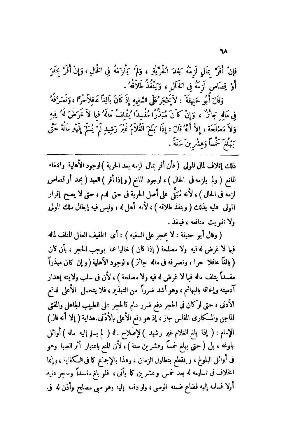 (وقال أبو حنيفة: لا يحجر على السفيه) : أي الخفيف العقل المتلف لماله فيما لا غرض له فيه ولا مصلحة (إذا كان) خاليا عما يوجب الحجر، بأن كان (بالغاً عاقلا حرا، وتصرفه في ماله جائز) ، لوجود الأهلية (وإن كان مبذراً مفسداً يتلف ماله فيما لا غرض له فيه ولا مصلحة) ، لأن في سلب ولايته إهدار آدميته وإلحاقه بالبهائم، وهو أشد ضرراً من التبذير، فلا يتحمل الأعلى لدفع الأدنى، حتى لو كان في الحجر دفع ضرر عام كالحجر على الطبيب الجاهل والمفتي الماجن والمكاري المفلس جاز، إذ هو دفع الأعلى بالأدنى. هداية (إلا أنه قال) الإمام: (إذا بلغ الغلام غير رشيد) لإصلاح ماله (لم يسلم إليه ماله) أوائل بلوغه، بل (حتى يبلغ خمساً وعشرين سنة) ، لأن المنع باعتبار أثر الصبا وهو في أوائل البلوغ، وينقطع بتطاول الزمان، وهذا بالإجماع كما في الكفاية، وإنما الخلاف في تسليمه له بعد خمس وعشرين كما يأتي، فلو بلغ مفسداً وحجر عليه أولا فسلمه إليه فضاع ضمنه الوصي، ولو دفعه إليه وهو صبي مصلح وأذن له في