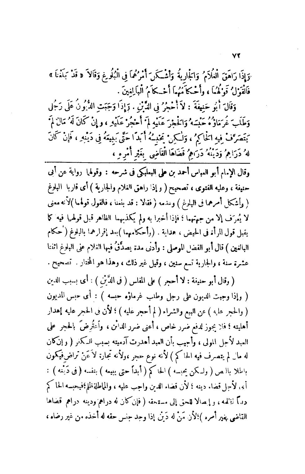 وقال الإمام أبو العباس أحمد بن علي البعلبكي في شرحه: وقولهما رواية عن أبي حنيفة، وعليه الفتوى، تصحيح (وإذا راهق الغلام والجارية) أي قاربا البلوغ (وأشكل أمرهما في البلوغ) وعدمه (فقالا: قد بلغنا، فالقول قولهما) لأنه معنى لا يعرف إلا من جهتهما؛ فإذا أخبرا به ولم يكذبهما الظاهر قبل قولهما فيه كما يقبل قول المرأة في الحيض، هداية. (وأحكامهما) بعد إقرارهما بالبلوغ (أحكام البالغين) قال أبو الفضل الموصلي: وأدنى مدة يصدق فيها الغلام على البلوغ اثنتا عشرة سنة، والجارية تسع سنين، وقيل غير ذلك، وهذا هو المختار. تصحيح.