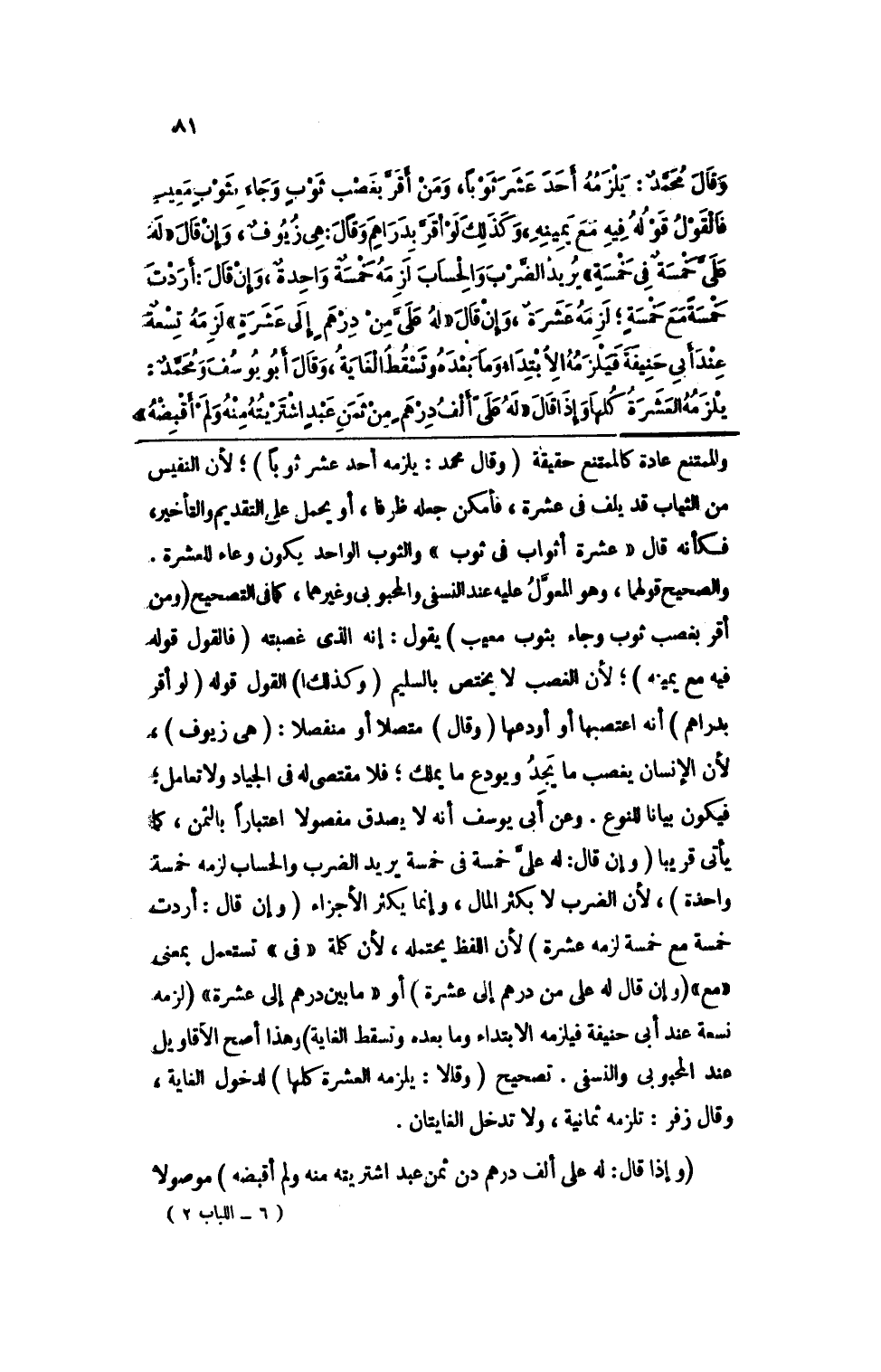 والصحيح قولهما، وهو المعول عليه عند النسفي والمحبوبي وغيرهما، كما في التصحيح (ومن أقر بغصب ثوب وجاء بثوب معيب) يقول: إنه الذي غصبته (فالقول قوله فيه مع يمينه) ؛ لأن الغصب لا يختص بالسليم (وكذلك) القول قوله (لو أقر بدراهم) أنه اغتصبها أو أودعها (وقال) متصلا أو منفصلا: (هي زيوف) ، لأن الإنسان يغصب ما يجد ويودع ما يملك؛ فلا مقتصى له في الجياد ولا تعامل؛ فيكون بيانا للنوع. وعن أبي يوسف أنه لا يصدق مفصولا اعتباراً بالثمن، كما يأتي قريبا (وإن قال: له علي خمسةو في خمسة يريد الضرب والحساب لزمه خمسة واحدة) ، لأن الضرب لا بكثر المال، وإنما يكثر الأجزاء (وإن قال: أردت خمسة مع خمسة لزمه عشرة) لأن اللفظ يحتمله، لأن كلمة "في" تستعمل بمعنى "مع" (وإن قال له علي من درهم إلى عشرة) أو "ما بين درهم إلى عشرة" (لزمه تسعة عند أبي حنيفة فيلزمه الابتداء وما بعده وتسقط الغاية) وهذا أصح الأقاويل عند المحبوبي والنسفي. تصحيح (وقالا: يلزمه العشرة كلها) لدخول الغاية، وقال زفر: تلزمه ثمانية، ولا تدخل الغايتان.