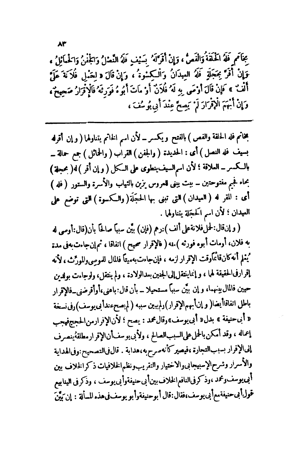 بخاتمٍ فله الحلقة والفص، وإن أقر له بسيفٍ فله النصل والجفن والحمائل، وإن أقر بحجلةٍ فله العيدان والكسوة، وإن قال "لحمل فلانة علي ألفٌ" فإن قال أوصى به له فلانٌ أو مات أبوه فورثه فالإقرار صحيحٌ، وإن أبهم الإقرار لم يصح عند أبي يوسف،